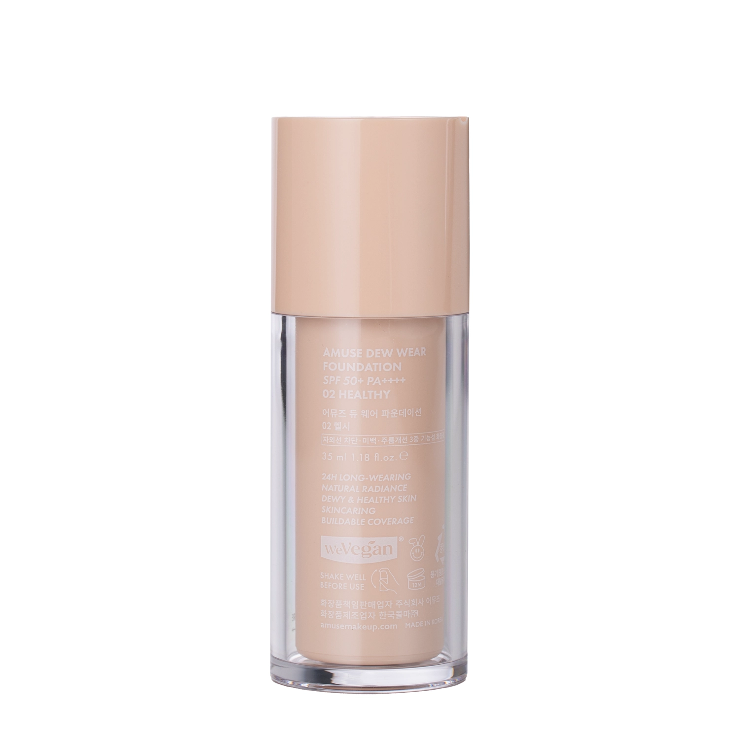 Amuse - Dew Wear Foundation SPF50 PA++++ - 02 Healthy - gelinės tekstūros makiažo pagrindas. Šiuolaikiška formulė suteikia švytėjimo, neapsunkina veido odos ir nesukuria kaukės efekto. Dėl gelinės tekstūros tepimas itin malonus, o makiažo pagrindas susilieja su oda, išlaikydamas ją gaivią ištisas valandas. Į makiažo pagrindo sudėtį įeina veikliosios medžiagos, kurios puoselėja ir gerina odos būklę. Sudėtyje esantis niacinamidas palaiko odos barjerą ir skaistina odą, o pantenolis ramina sudirgimus ir raudonį. Sudėtyje esantis ryžių ekstraktas pasižymi maitinamuoju ir lyginamuoju poveikiu, o įvairių formų hialurono rūgštis užtikrina ilgalaikį drėkinimą, išlaikydama odą minkštą ir elastingą. Makiažo pagrindas praturtintas mišriais filtrais, padedančiais apsaugoti odą nuo žalingo UV spindulių poveikio. Formulė yra visiškai veganiška, o papildomas keičiamas įdėklas padeda sumažinti plastiko naudojimą.