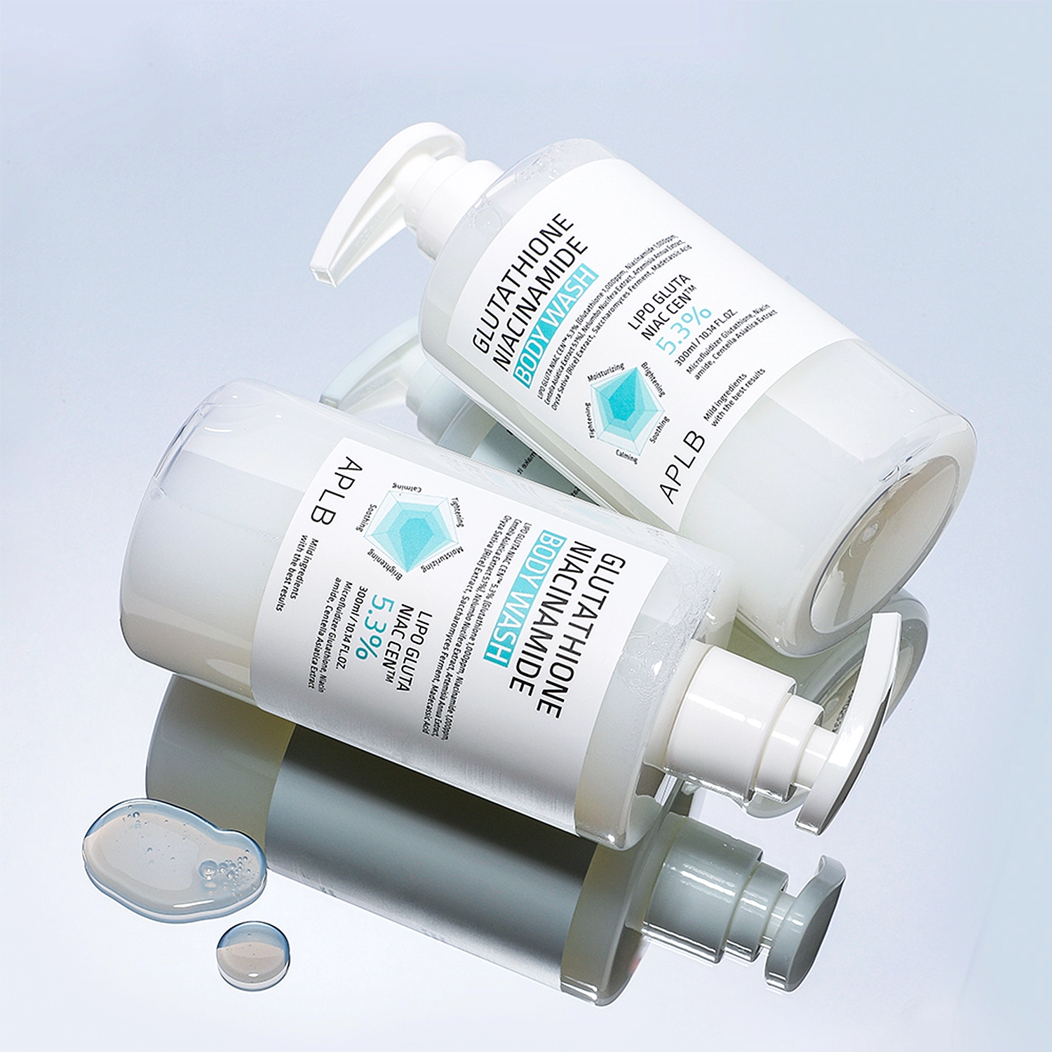 APLB - Glutathione Niacinamide Body Wash - hipoalerginė kūno prausimosi želė. Kosmetikos sudėtyje esantis niacinamidas malšina uždegimus ir stiprina odos hidrolipidinį barjerą. Pridėtas glutationas skaistina odą ir neutralizuoja žalingą laisvųjų radikalų poveikį, o gaminyje esantis azijinės centelės lapų vanduo veikia raminamai. Dėl iš azijinės centelės išskirtų medžiagų ( azijinė rūgštis, madekaso rūgštis ir asiatikozidas) gelis pasižymi regeneruojančiomis savybėmis. Be to, kosmetikos formulė praturtinta skvalanu, kuris pagerina odos drėkinimo lygį. Gelis švelniai ir veiksmingai valo kūno odą, palikdamas ją lygią ir švelnią liesti.