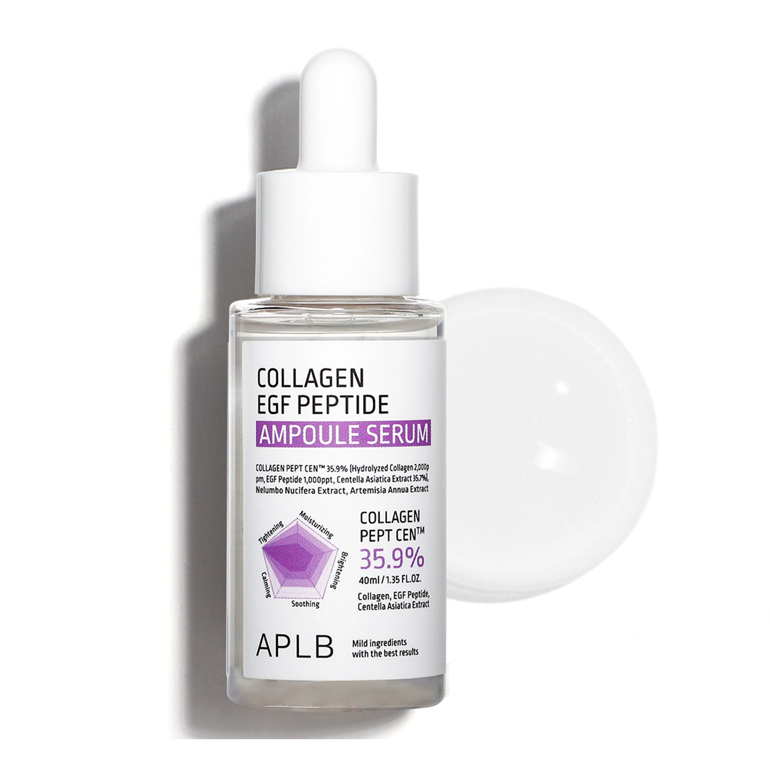 APLB - Collagen EGF Peptide Ampoule Serum - serumas, pasižymintis lengva gelio tekstūra ir intensyviu drėkinamuoju, regeneruojamuoju ir stangrinamuoju poveikiu. Jo sudėtyje yra azijinės centelės ekstraktas ir azijinė rūgštis, madekaso rūgštis ir asiatikozidas, t. y. iš jo išskirtos medžiagos. Toks veikliųjų medžiagų pasirinkimas užtikrina visapusišką atkuriamąjį poveikį ir priešuždegiminį. Pridėti sh-oligopeptide-1 ir hidrolizuotas kolagenas pastebimai gerina odos drėkinimo lygį, be to, EGF peptidas padidina odos stangrumą, tankumą ir elastingumą. Sudėtį užbaigia skvalanas, kuris maksimaliai padidina kitų veikliųjų medžiagų skvarbą, taip pat maitina ir drėkina. Todėl serumas ne tik ramina sausą ar dehidratuotą odą, bet ir atkuria tinkamą jautrios ar sudirgusios odos pusiausvyrą. Dėl savo senėjimą stabdančių savybių serumas tinka ir odai su pirmaisiais senėjimo požymiais ir šerpetojančiai odai. Priemonės pH yra švelniai rūgštus - nuo 5,0 iki 6,5, jos sudėtyje nėra kvapiųjų medžiagų ir mineralinių aliejų.