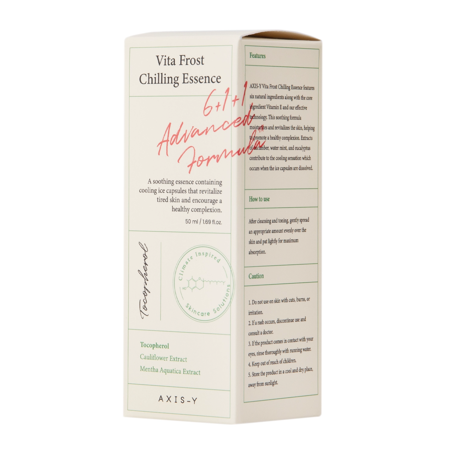 Axis-y - Vita Frost Chilling Essence - gelinės konsistencijos veido esencija, kuri suteikia švelnų, malonų vėsinimo efektą. Ramina sudirgusią odą ir mažina paraudimus. Lengva tekstūra lengvai įsigeria. Sudėtyje yra antioksidacinis vitaminas E, uždarytas mažose kapsulėse. Esencijos sudėtyje gausu augalų ekstraktų, įskaitant vandens mėtų ir eukalipto ekstraktus, kurie suteikia vėsinantį poveikį. Agurkų ekstraktas veikia priešuždegimiškai ir švelnina. Produktas suteikia palengvėjimą sudirgusiai, paraudusiai veido odai. Formulė yra veganiška ir natūrali.