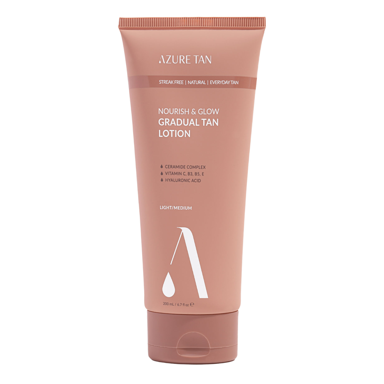 Azure Tan- Nourish & Glow Gradual Tan Lotion - Light/Medium - kūno losjonas, kuris palaipsniui įdegina odą. Keramidai Sudėtyje yra niacinamido, kuris pasižymi priešuždegiminiu ir šviesinančiu poveikiu, taip pat mažina riebalinių liaukų išsiskyrimą. stiprina natūralų odos apsauginį barjerą ir apsaugo nuo išsausėjimo, atkuria drėgmės pusiausvyrą. Be to, pantenolis ramina sudirgimą, spartina odos regeneraciją ir palaiko odos drėkinimo lygį. Simondsijų aliejus maitina ir atgaivina odą, suteikia jai elastingumo ir stangrumo, o kavos ekstraktas padeda mažinti celiulitą, taip pat veikia kaip natūralus antioksidantas ir stimuliuoja kraujotaką. Losjonas suteikia odai nestiprų įdegio efektą ir akivaizdžiai skaistina odą. Produktas yra veganiškas.