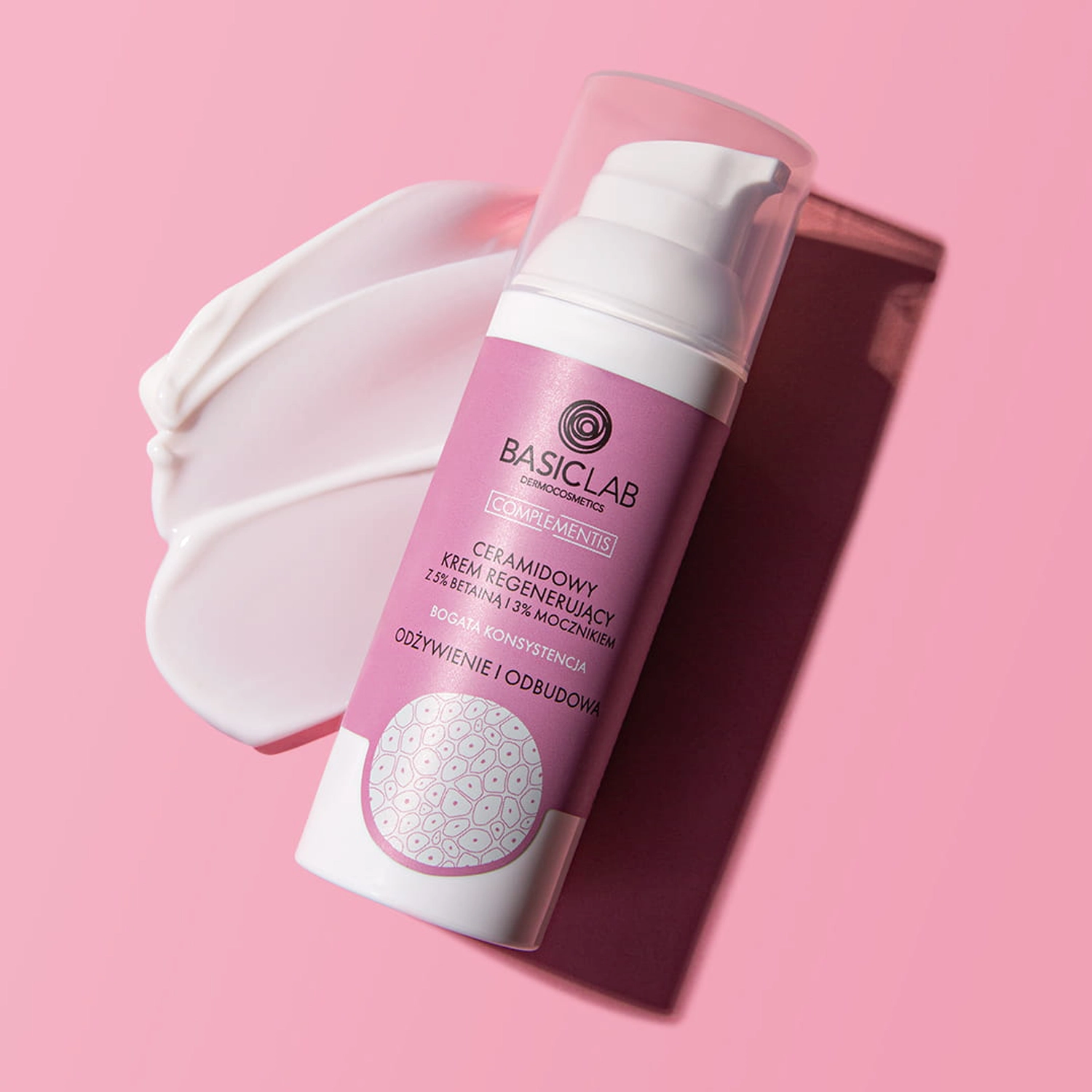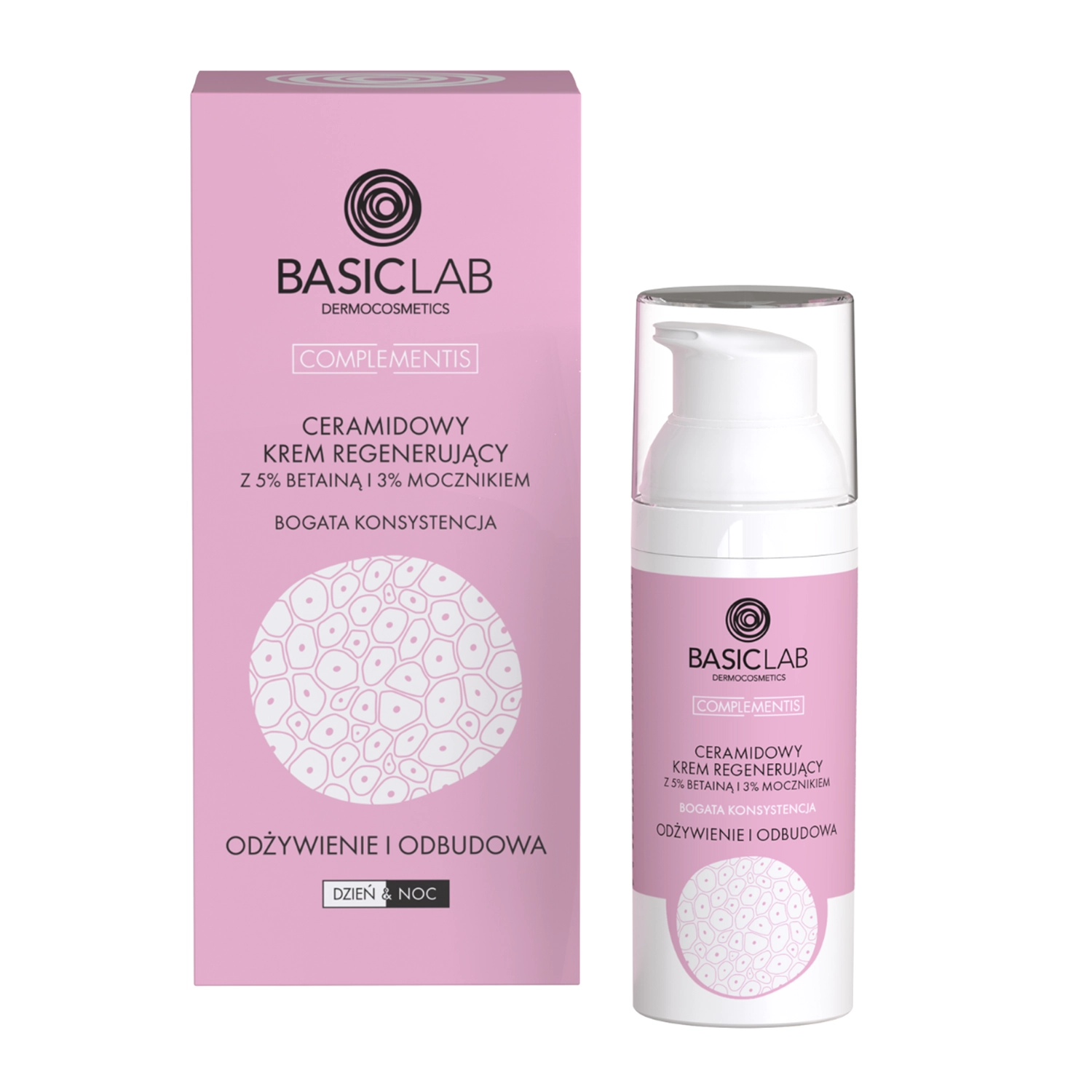 BasicLab - Complementis – Keramidų Sodrus Regeneruojamasis Kremas su Betainu ir Karbamidu – skirtas kasdieniam naudojimui ryte ir vakare, rūpinasi tinkamu hidrolipidinio barjero funkcionavimu. Giliai maitina ir drėkina odą dėl keramidų, kurie stiprina odos barjerą ir regeneruoja. 3 % karbamido ir 5 % betaino intensyviai maitina ir drėkina. Fitosfingozinas savo ruožtu mažina paraudimą ir malšina uždegimą bei odos sudirgimą. Cholesterolis stiprina hidrolipidinį barjerą, o trehalozė suriša vandenį odoje, kad ji išliktų sudrėkinta. Taukmedžio sviestas intensyviai minkština ir apsaugo odą nuo išsausėjimo. Turtinga kremo formulė palieka apsauginį sluoksnį ant odos. Jį gali naudoti krūtimi maitinančios ir nėščios moterys, taip pat vaikai nuo 3 metų amžiaus.