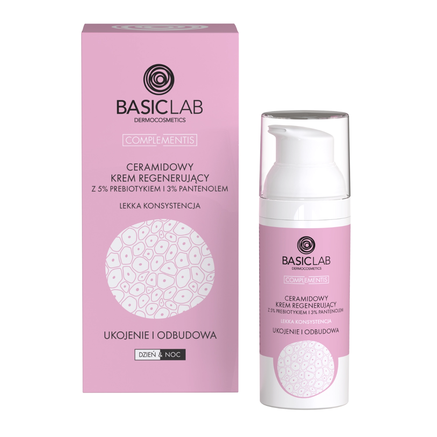 BasicLab - Complementis - Lengvas Regeneruojamasis Keramidų Kremas su Prebiotiku ir Pantenoliu – skirtas kasdieniam naudojimui ryte ir vakare, rūpinasi tinkamu hidrolipidinio barjero funkcionavimu. Sudėtyje yra keramidai, kuris stiprina odos barjerą, regeneruoja ir saugo nuo sausumo. 5 % prebiotiko atkuria mikrobiomo pusiausvyrą, ramina ir mažina sudirgimą bei uždegimą. Savo ruožtu 3 % pantenolio turi gydomąjį, raminamąjį ir drėkinamąjį poveikį, mažina epidermio vandens netekimą ir veiksmingai drėkina odą, todėl ji tampa minkšta ir elastinga. Alantoinas ramina ir malšina sudirgimą, o niacinamidas stiprina odos barjerą ir pasižymi skaistinamuoju bei priešuždegiminiu poveikiu. Pridėjus karbamido ir arginino sustiprinamas drėkinamasis produkto poveikis. Kremas nepalieka riebios plėvelės. Jį gali naudoti krūtimi maitinančios ir nėščios moterys, taip pat vaikai nuo 3 metų amžiaus.