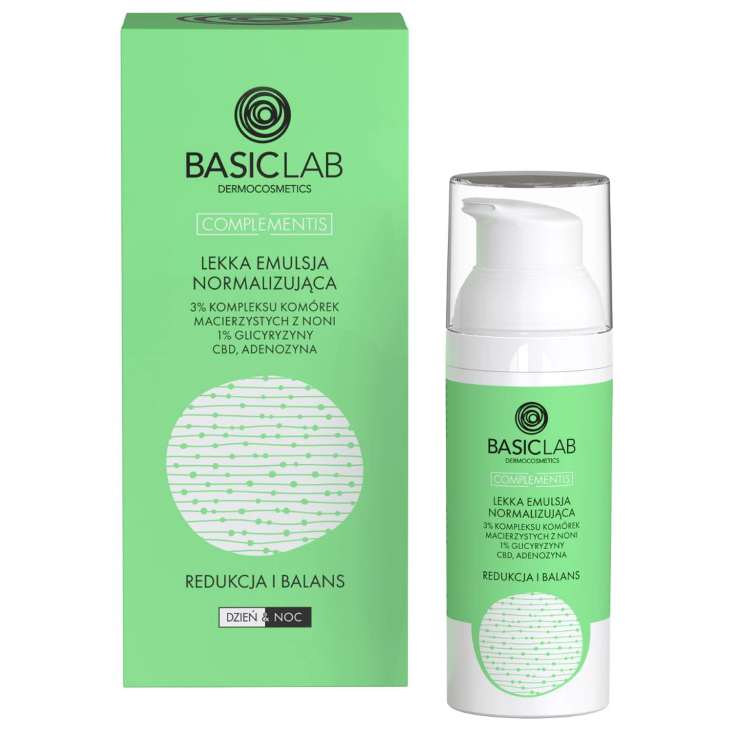 BasicLab - Reduction and Balance - Light Normalizing Emulsion 3% kamieninių ląstelių kompleksas su noni, 1% glicirhizinas, CBD ir adenozinas - veido emulsija, skirta mišrios, riebios ir į aknę linkusios odos rytinei ir vakarinei priežiūrai. Lengva tekstūra greitai įsigeria ir palieka satininį atspalvį. Jos formulę sudaro 3 % noni kamieninių ląstelių kompleksas, kuris kartu su CBD ir sarkozinu normalizuoja riebalų išsiskyrimą, mažina aknės pažeidimus ir užkerta kelią jų susidarymui. 1 % koncentracijos glicirizinas turi normalizuojantį poveikį ir išlygina odos spalvą, o trehalozė rūpinasi odos drėkinimu. Kremas mažina porų atsiradimą ir lygina odos tekstūrą. Jis yra veganiškas ir be kvapiklių.