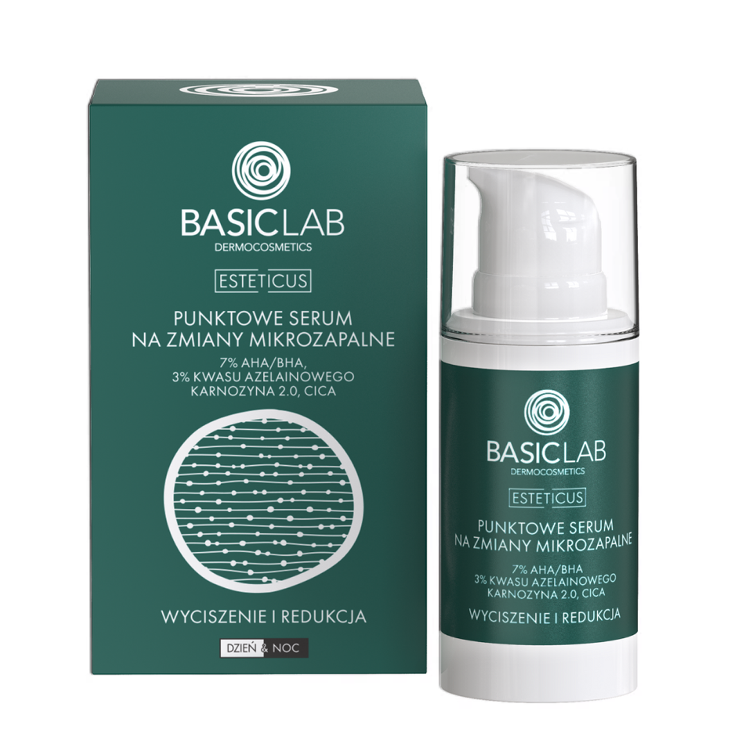 BasicLab – Taškinis Serumas Netobulumams – koncentruotas taškinis serumas mikrouždegiminiams pažeidimams.Sudėtyje yra daugiakrypčio veikimo ingredientų, kurie veiksmingai gerina odos būklę. Šikimo rūgštis pasižymi eksfoliaciniu, antibakteriniu poveikiu ir reguliuoja sebumo gamybą, todėl padeda išlyginti odos tekstūrą ir šviesinti hiperpigmentaciją. Azelaino rūgštis stabdo spuogus sukeliančių bakterijų augimą ir mažina hiperpigmentaciją. Salicilo rūgštis efektyviai kovoja su juodaisiais taškeliais ir per dideliu riebalų išsiskyrimu, užkerta kelią egzemai. Laktoferinas normalizuoja riebalų sekreciją ir malšina uždegimą, o karnozinas drėkina, gerina epidermio struktūrą, neutralizuoja laisvuosius radikalus ir neleidžia išryškėti spalvai.