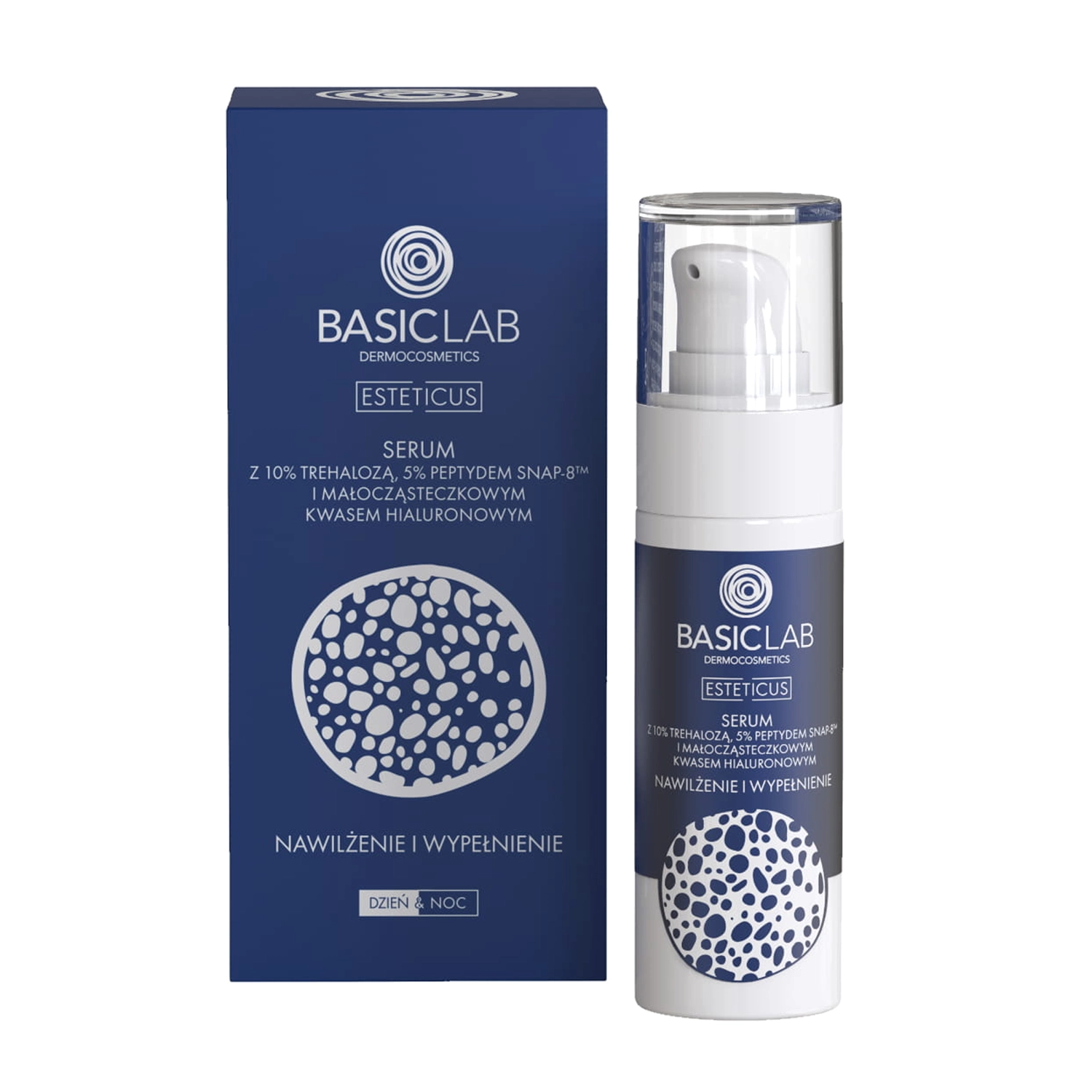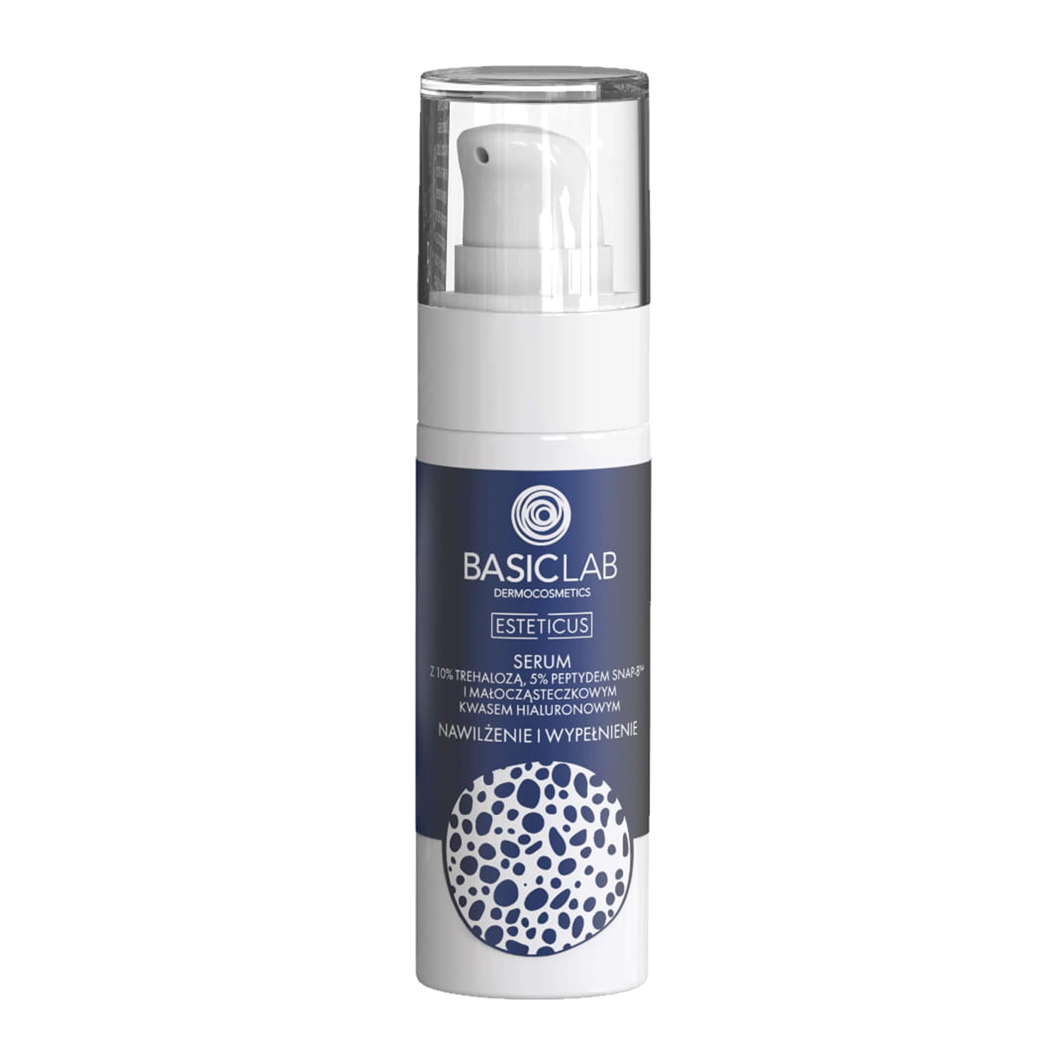 BasicLab - Esteticus - serumas su 10 % trehalozės, 5 % peptido SNAP-8 ir mažų molekulių hialurono rūgštimi - drėkinamųjų ir senėjimą stabdančių savybių turintis serumas. Sudėtyje yra 10 % trehalozės, kuri sulaiko vandenį epidermyje, 5 % neuropeptido SNAP-8, kuris mažina veido raukšles ir daro odą elastingesnę, ir 2 formų hialurono rūgšties, pasižyminčios drėkinamuoju poveikiu. Be kitų sudedamųjų dalių, serumas praturtintas regeneruojančiu skvalanu, kuris malšina sudirgimą ir yra stiprus antioksidantas, niacinamidu, kuris apsaugo nuo hiperpigmentacijos ir reguliuoja riebalinių liaukų veiklą, ir karbamidu, kuris minkština ir drėkina odą.