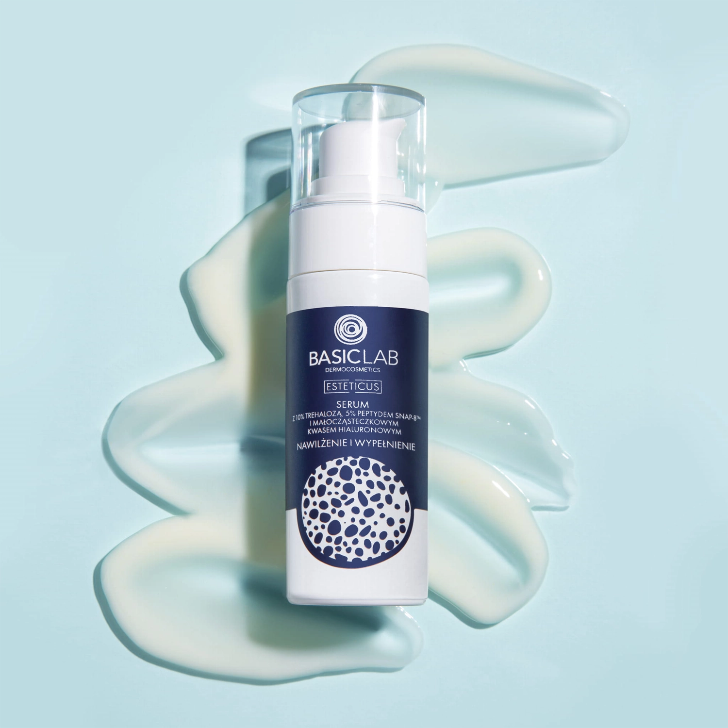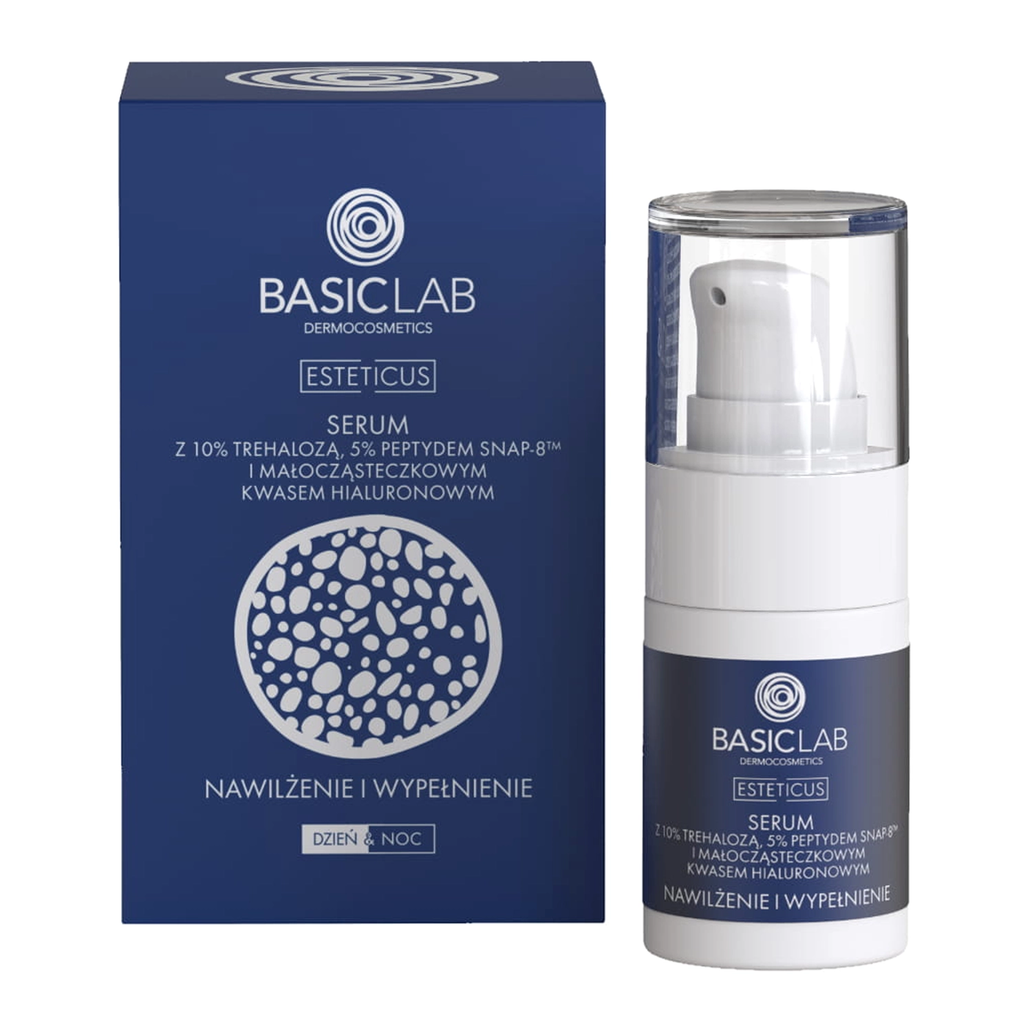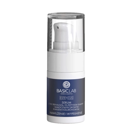 BasicLab - Esteticus - serumas su 10 % trehalozės, 5 % peptido SNAP-8 ir mažos molekulinės masės hialurono rūgštimi - drėkinamųjų ir raukšles mažinančių savybių turintis serumas. Sudėtyje yra 10 % trehalozės, kuri sulaiko vandenį epidermyje, 5 % neuropeptido SNAP-8, kuris mažina veido raukšles ir daro odą elastingesnę, ir 2 formų hialurono rūgšties, pasižyminčios drėkinamuoju poveikiu. Be kitų sudedamųjų dalių, serumas praturtintas regeneruojančiu skvalanu, kuris malšina sudirgimą ir yra stiprus antioksidantas, niacinamidu, kuris apsaugo nuo hiperpigmentacijos ir reguliuoja riebalinių liaukų veiklą, ir karbamidu, kuris minkština ir drėkina odą.