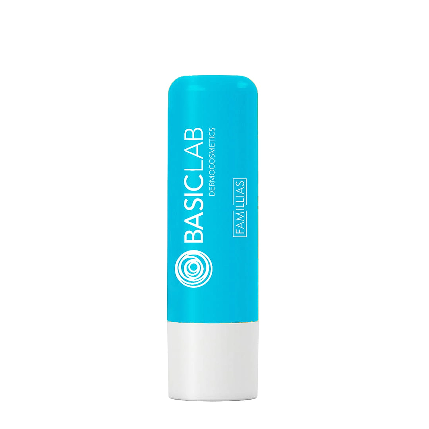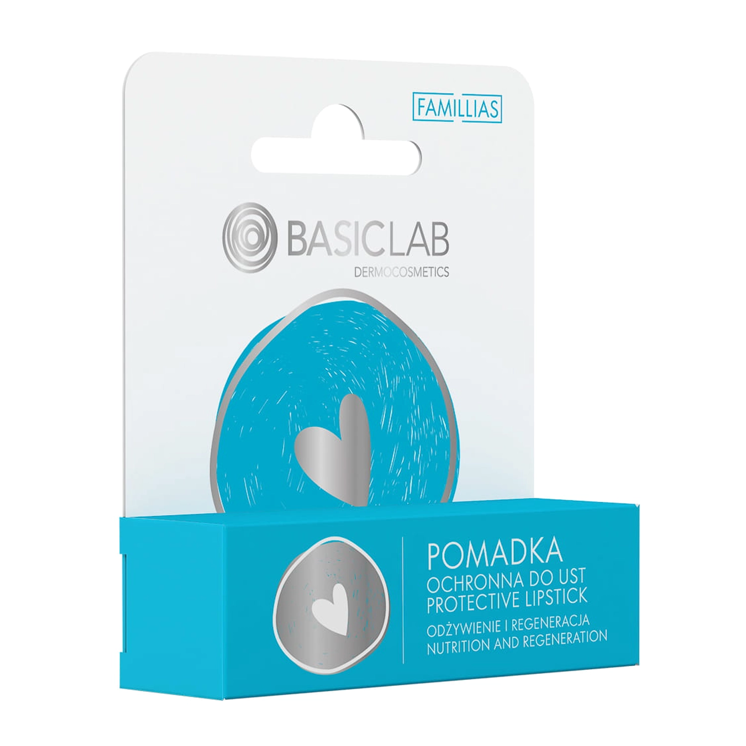 BasicLab - Famillias - Lip Protection Lipstick - priemonė puikiai prižiūri ir palaiko suskilinėjusių lūpų regeneraciją. Sudėtyje esantis ricinos aliejus palieka apsauginį sluoksnį ant lūpų ir jas minkština. Produkto sudėtyje taip pat yra bičių vaško, kuris apsaugo lūpas nuo neigiamo išorinių veiksnių, tokių kaip šaltis, vėjas ar saulė, poveikio ir suteikia joms blizgesio. Sudėtyje esantis vitaminas E maitina ir stiprina suskeldėjusias lūpas. Lūpų dažai yra švelnaus, malonaus aromato.