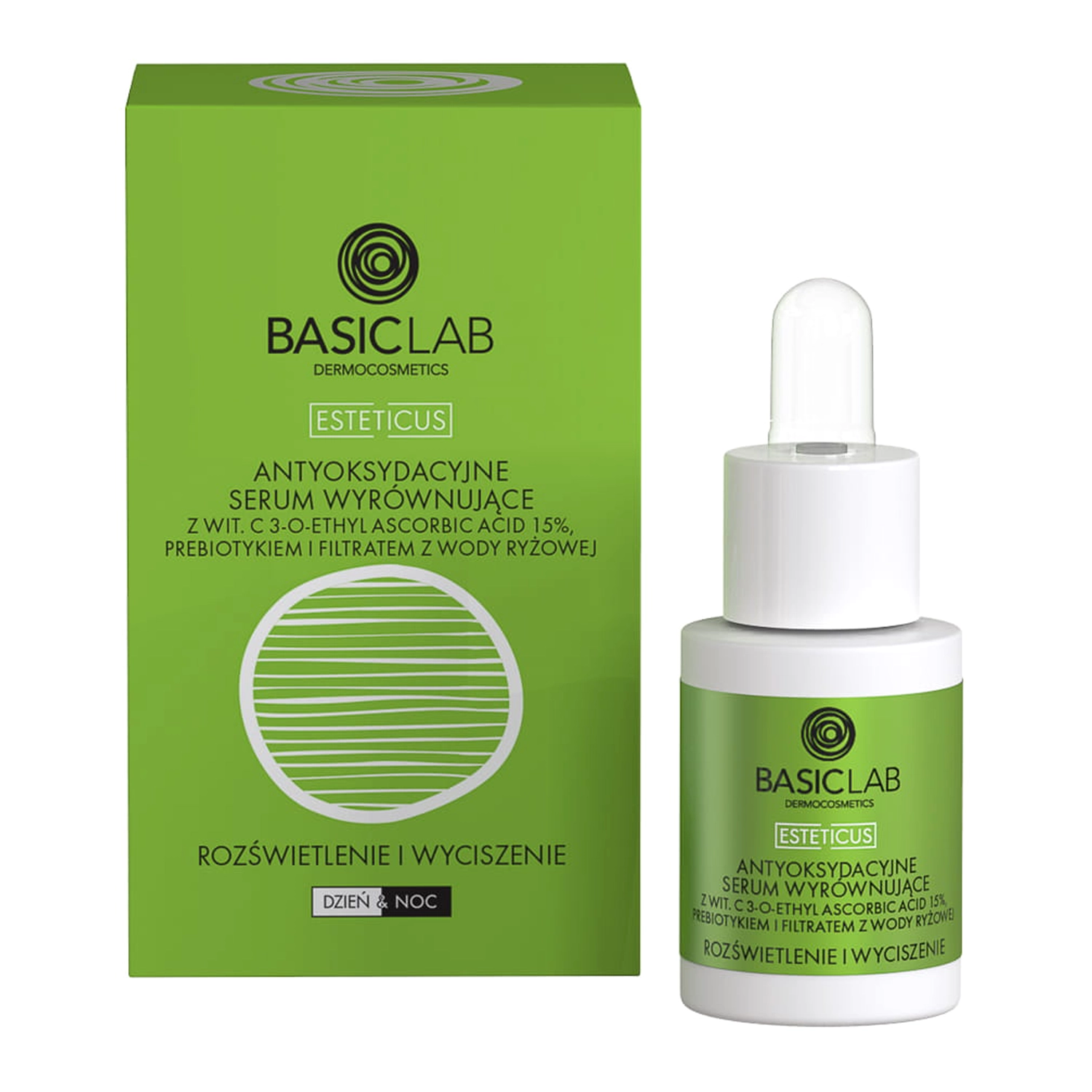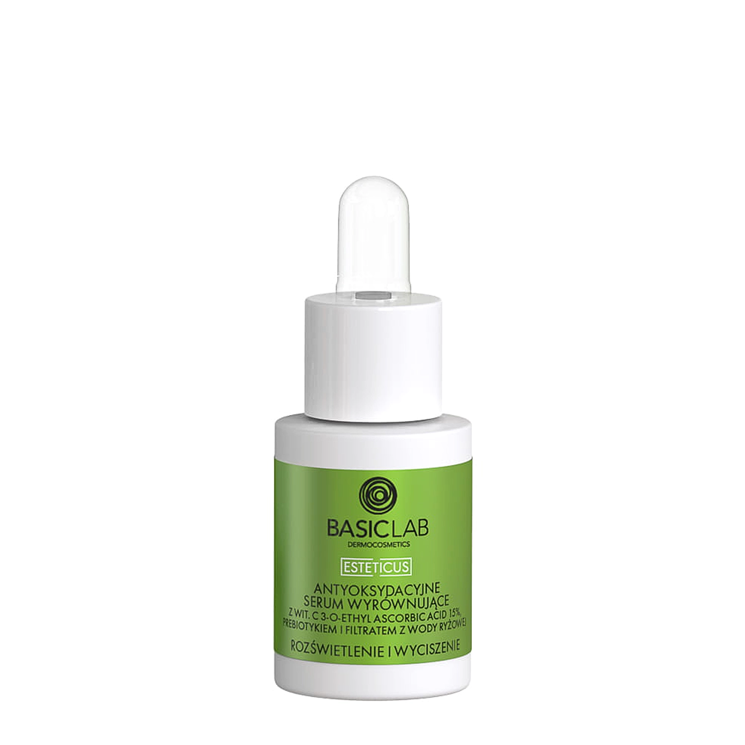 BasicLab - Esteticus - šviesinantis ir raminantis - Antioksidacinis serumas su vandens-gelio formule, kurio sudėtyje yra 15% stabilios formos vitamino C. Jis suteikia odai pažangią antioksidacinę apsaugą, pagerina odos tonusą, suteikia jai elastingumo ir stangrumo. Serumo sudėtyje esantis prebiotikas rūpinasi odos mikrobiomu, o mikroelementų turtingas ryžių vandens filtratas drėkina ir ramina. Serumo sudėtyje yra daug antioksidantų, tokių kaip glutationas, resveratrolis ir agurkų ekstraktas. Vijoklinių uogų ekstraktas ramina ir švelnina odą. Priemonė skirta kasdieniam naudojimui dieną ir naktį.