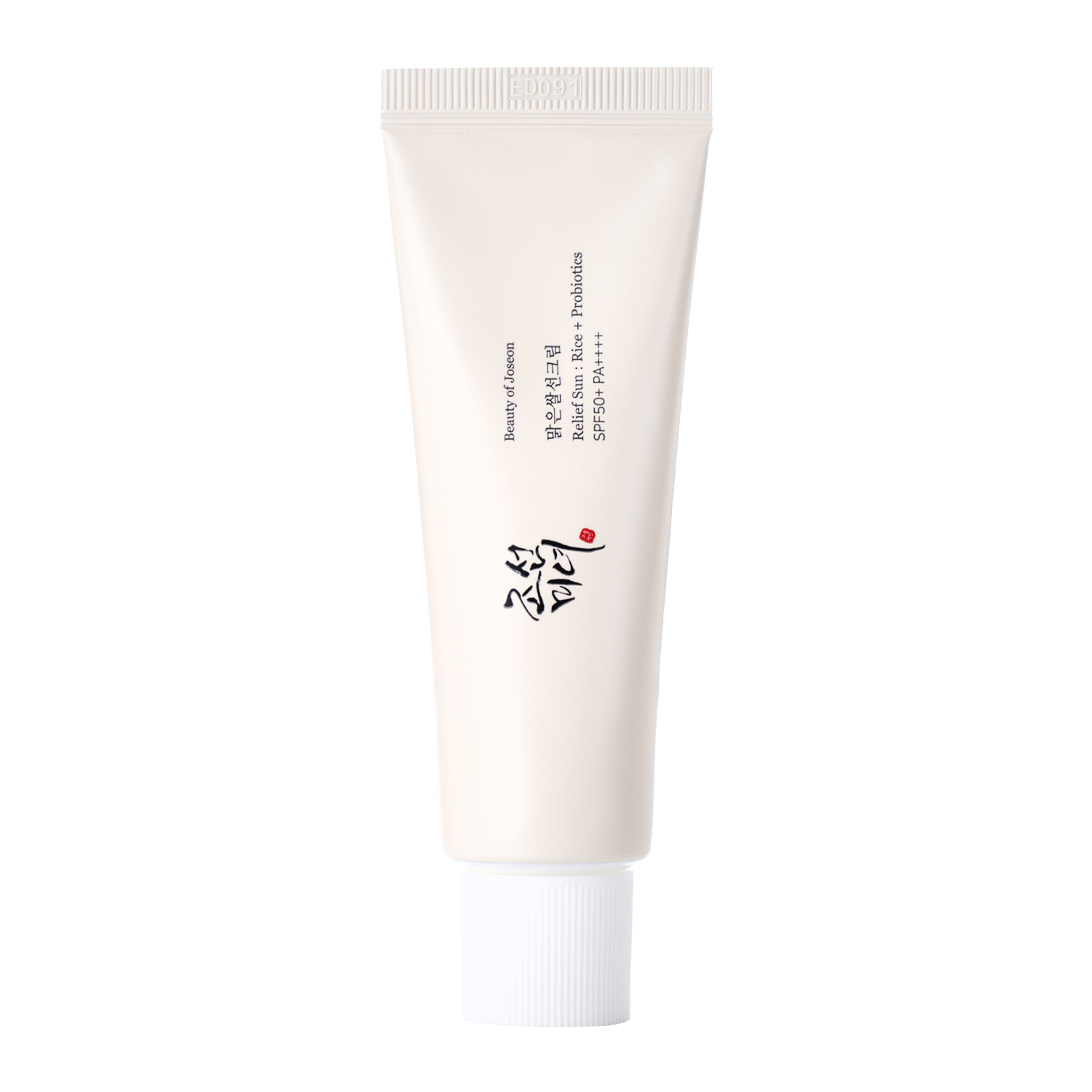 Beauty of Joseon - Relief Sun Rice Probiotics - SPF50+/PA++++ – kremas, kuris apsaugo veido odą nuo kenksmingų UVA ir UVB spindulių. Sudėtyje yra ryžių ekstraktas, kuris pasižymi antioksidaciniu poveikiu ir neutralizuoja laisvuosius radikalus, susidarančius ant odos dėl UV spindulių. Papildomai produkto sudėtyje yra cheminių filtrų, kurie veiksmingai riboja saulės spindulių patekimą į odos paviršių ir gilesnius jos sluoksnius. Be to, formulė papildyta vertingu pieno rūgšties bakterijų biofermentu, kuris drėkina odą ir užkerta kelią aknės susidarymui, taip pat išlyginamuoju adenozinu ir maitinamuoju vitaminu E. Kremas greitai įsigeria, yra malonaus kvapo ir sukuria ant odos satininį-švytintį išbaigimą, suteikdamas jai „stiklinės odos“ efektą. Formulė yra lengva, nelipni ir nepalieka balto pėdsako, negana to, ji sukomponuota iš natūralios kilmės sudedamųjų dalių ir yra veganiška.