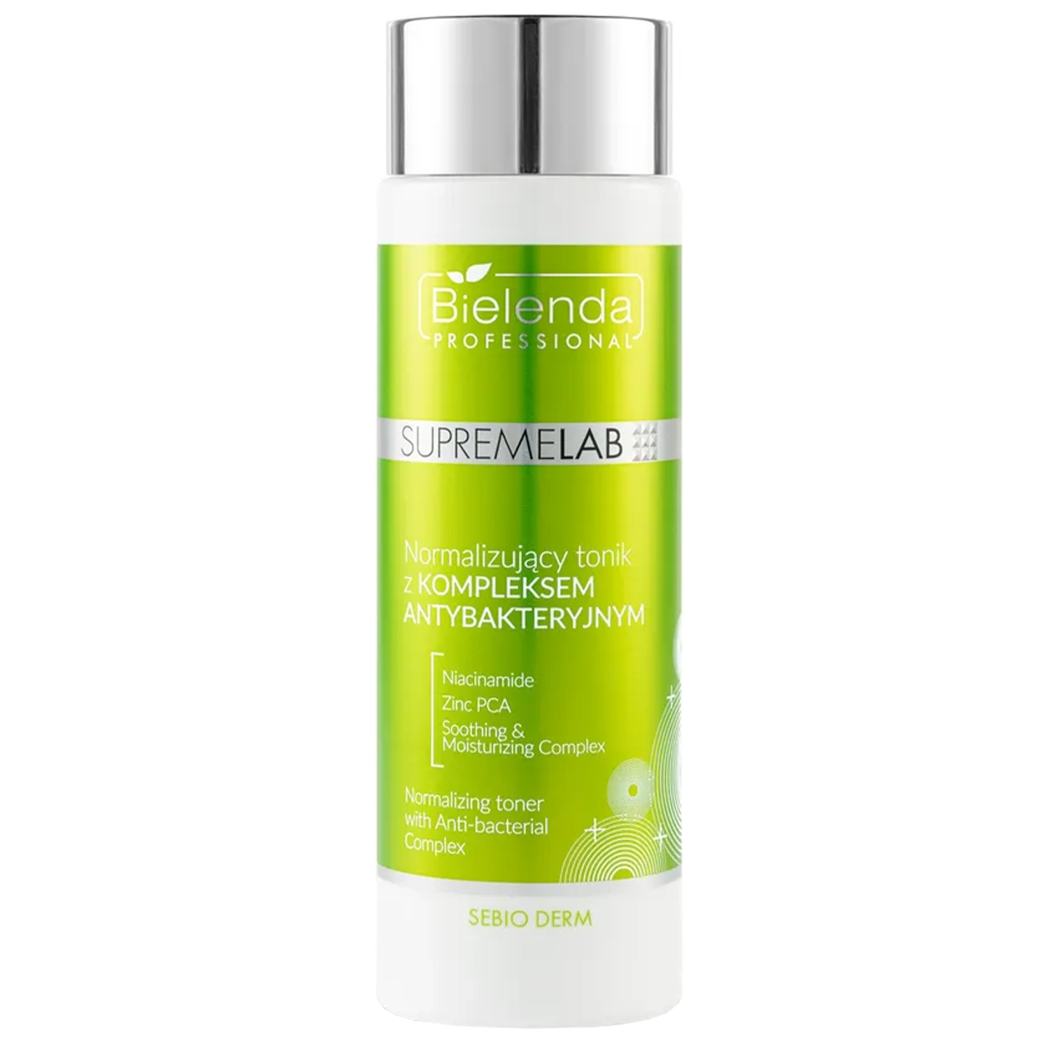Bielenda Professional - Supremelab - Sebio Derm - Normalizing Toner with Anti-Bacterial Complex - Normalizuojantis Tonikas su Antibakteriniu Kompleksu - sudėtyje yra 5 % koncentracijos niacinamido, kuris stiprina odos apsauginį barjerą, reguliuoja riebalų išsiskyrimą, pasižymi antioksidaciniu, priešuždegiminiu ir šviesinamuoju poveikiu, mažina riebalines liaukas. Arbatmedžio aliejus pasižymi antiseptiniu ir priešuždegiminiu poveikiu, o laktobiono rūgštis gerina odos drėkinimo lygį, stiprina epidermio barjerą, pasižymi antioksidaciniu poveikiu. Be to, produkto sudėtyje yra 0,5 % koncentracijos cinko PCA. Tai cinko derinys su pirolidinkarboksirūgštimi, kuri natūraliai randama odoje kaip NMF (natūralaus drėkinamojo faktoriaus) sudedamoji dalis, veikia riebalines liaukas ir mažina riebalų sekrecijos lygį (5-α-reduktazės inhibitorius), taip pat slopina bakterijų, atsakingų už aknės pažeidimų susidarymą, dauginimąsi. Kita vertus, mandelinė rūgštis normalizuoja riebalinių liaukų veiklą ir reguliuoja sebumo gamybą, karbamidas turi drėkinamąjį poveikį, o hialurono rūgštis suriša vandenį epidermyje, palaikydama optimalų odos drėkinimo lygį.