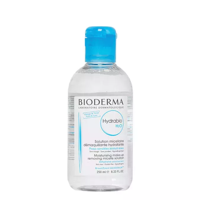 Bioderma - Hydrabio H2O - micelinis losjonas makiažo valymui ir sausai, dehidratuotai ir jautriai odai valyti. Sudėtyje yra Aquagenium™ patento, kuris užtikrina, kad nešvarumai būtų pašalinti nepažeidžiant odos hidrolipidinio barjero, todėl oda nepraranda drėgmės. Be to, papildytas yra cukrais, niacinamidu ir agurkų bei obuolių ekstraktu, kurie drėkina ir ramina odą.