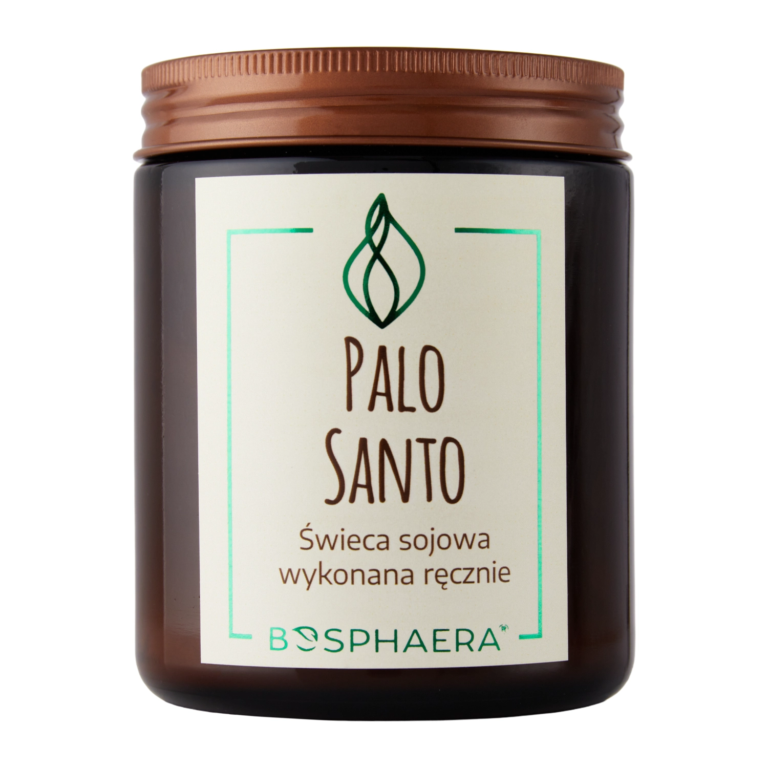 Bosphaera - Sojų žvakė - Palo Santo - natūrali, ekologiška žvakė, pagaminta iš sojų vaško. Malonaus palo santo aromato, kuris suteikia atsipalaidavimo ir ramybės nuotaiką. Dominuoja citrusų, mėtų ir gėlių natos, papildytos medienos aromatu. Žvakės kvapas primena egzotinį mišką. Produktas supakuotas į ekologiško tamsaus stiklo indelį, kurį galima pakartotinai panaudoti. Žvakė turi medinį dagtį, kuris degdamas skleidžia atpalaiduojantį laužo spragsėjimą.