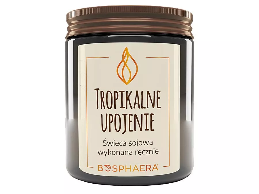 Bosphaera - Świeca Sojowa - Tropikalne Upojenie - naturalna, ekologiczna, ręcznie wykonana świeca z wosku sojowego o zapachu owoców tropikalnych, który dodaje energii i pobudza. Zawiera drewniany knot oddający dźwięki letniego ogniska w czasie palenia. Świeca znajduje się w ekologicznym, eleganckim, ciemnym szkle, który w łatwy sposób można wyczyścić po zużyciu oraz ponownie wykorzystać. Egzotyczny zapach świecy świetnie sprawdzi się do palenia w ciągu dnia.
