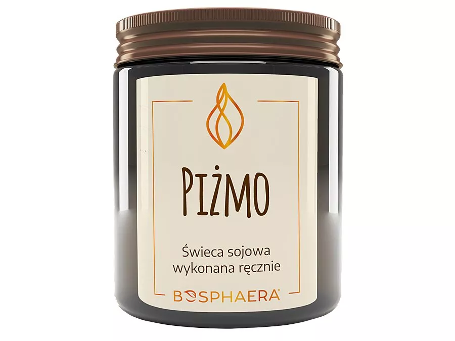 Bosphaera - Świeca Sojowa - Piżmo - naturalna, ekologiczna, ręcznie wykonana świeca z wosku sojowego o zapachu piżma, który ma charakterystyczny zapach kojarzący się z luksusem. Zawiera drewniany knot oddający dźwięki letniego ogniska w czasie palenia. Świeca znajduje się w ekologicznym, eleganckim, ciemnym szkle, który w łatwy sposób można wyczyścić po zużyciu oraz ponownie wykorzystać. Przyjemny zapach świecy sprawdzi się do palenia szczególnie w łazience czy salonie kosmetycznym.
