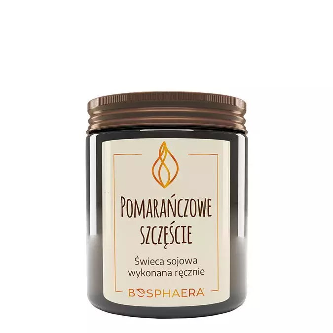 Bosphaera - Świeca Sojowa - Pomarańczowe Szczęście - świeca wykonana jest na bazie 100% naturalnego, ekologicznego wosku sojowego. Pali się w temperaturze niższej niż parafina i nie uwalnia szkodliwych związków. Wiodącą nutą jest zapach kwiatu pomarańczy i moreli, nadający słodki owocowy zapach, którym można cieszyć się przez wiele godzin. W świecy zastosowano drewniany knot oddający dźwięk palonego drewna w ognisku. Produkt został umieszczony w ciemnym ekologicznym szkle, które po oczyszczeniu nadaje się do ponownego użytku.