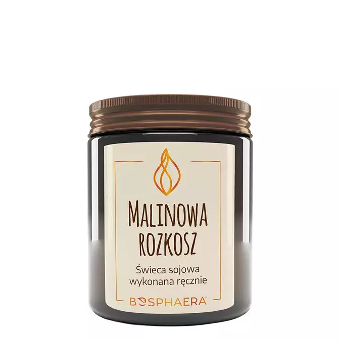 Bosphaera - Świeca Sojowa - Malinowa Rozkosz - świeca wykonana jest na bazie 100% naturalnego, ekologicznego wosku sojowego. Pali się w temperaturze niższej niż parafina i nie uwalnia szkodliwych związków. Wiodącą nutą jest zapach wanilii i maliny, którym można cieszyć się przez wiele godzin. W świecy zastosowano drewniany knot oddający dźwięk palonego drewna w ognisku. Produkt został umieszczony w ciemnym ekologicznym szkle, które po oczyszczeniu nadaje się do ponownego użytku.