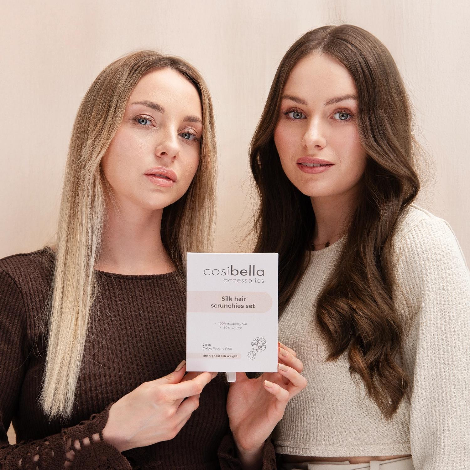 Cosibella Accessories - Šilkinių Plaukų Gumyčių Rinkinys - Peachy Pink – šilkinės plaukų gumytės, pagamintos iš itin patvaraus 30 momme šilko. Pakuotėje yra platesnė (4 cm) ir siauresnė (1,5 cm) gumelės, kurios puikiai tiks bet kokiai progai – nuo treniruotės, per darbą, iki vakarinių išėjimų. Medžiaga – 100% šilkinių morvų šilkas su labai aukšta (prabange) 30 momme gramatura, todėl gumelės yra nepaprastai lygios, blizgios ir ilgaamžės – išlaiko savo išvaizdą net kasdien naudojant. Mūsų gumelės turi gerai apgalvotą ir tinkamai parinktą ilgį, pūkumą ir medžiagos elastingumą, kas užtikrino aukštos kokybės šilko apsaugą nuo greito susiglamžymo ir susukimo. Svarbu tai, kad šilkinis audinys taip pat užkerta kelią plaukų deformacijai, sumažina plaukų lūžimą ir tvirtai laiko plaukus, nespaudžiant jų. Gumelės turi klasikinį ir daugeliui stilių tinkantį persikinį atspalvį, o rinkinys leidžia pritaikyti gumelės dydį įvairioms progoms, šukuosenoms ir plaukų tipams. Produktas supakuotas į tvirtą, elegantišką dėžutę, tinkamą dovanai.