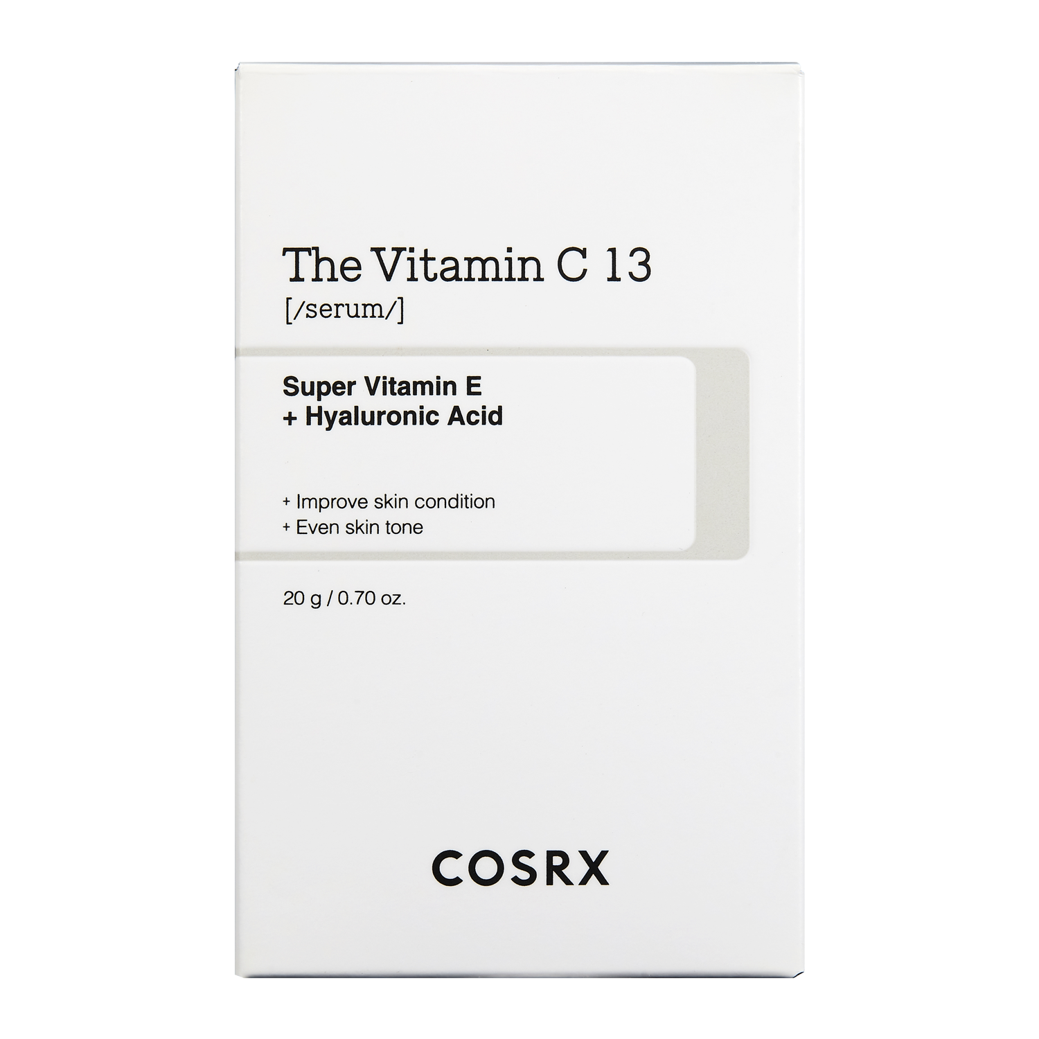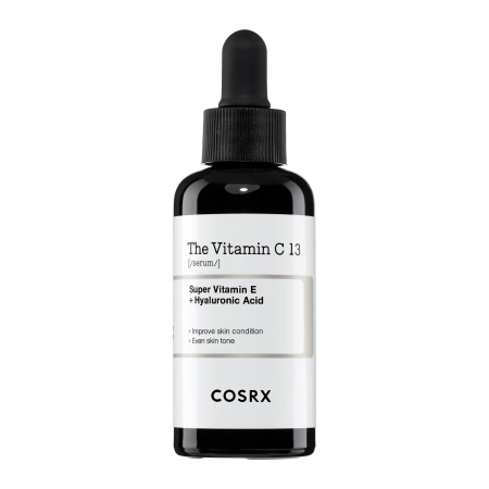 Cosrx - The Vitamin C 13 Serum - koncentruotos sudėties veido serumas, kurio sudedamųjų dalių sudėtis padeda šviesinti hiperpigmentaciją ir suvienodinti odos atspalvį. Sudėtyje esantis vitaminas C (13 % askorbo rūgšties ir 3-0-etilo askorbo rūgštis) rūpinasi skaistumo atkūrimu, naikina matiškumą ir lėtina senėjimo procesus. Kita vertus, niacinamidas pasižymi antioksidacinėmis savybėmis ir skatina skaistinimą. Be to, glutationas yra stiprus antioksidantas ir pasižymi senėjimą stabdančiu poveikiu, o natrio hialuronatas gerina odos drėkinimą. Pridėtas vitaminas E apsaugo nuo laisvųjų radikalų, užkerta kelią priešlaikiniam senėjimui.
