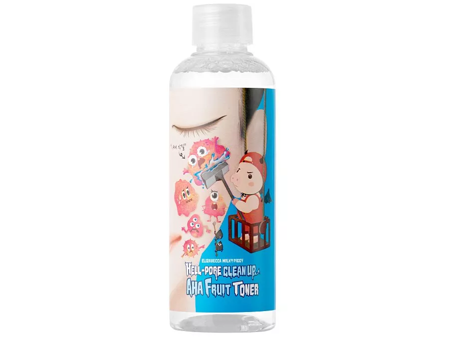 Elizavecca - Hell Pore Clean Up AHA Fruit Toner - šveičiamasis tonikas, kuris padeda kovoti su probleminiais inkštirais. Pagrįstas pieno rūgštimi, kuri pasižymi švelniu šviesinamuoju ir drėkinamuoju poveikiu, taip pat glikolio rūgštimi, kuri šveičia epidermį ir reguliuoja sebumo išsiskyrimą. Į produktą įtraukti šias savybes stiprinantys ekstraktai, pvz., žvaigždinio anyžiaus ekstraktas, kuris pasižymi stipriomis antibakterinėmis savybėmis.