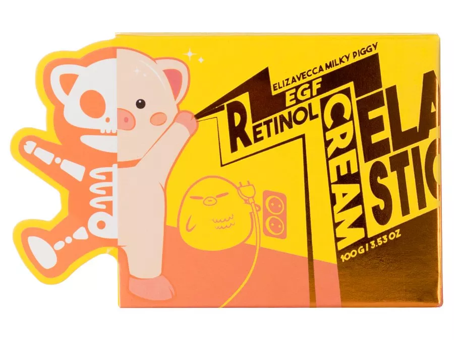 Elizavecca - Milky Piggy EGF Elastic Retinol Cream - kremas, pagrįstas Swiftlet lizdų ekstraktu su vitaminu A retinolio pavidalu. Abi šios medžiagos pasižymi anti-senėjimo, šviesinančiu ir odos nelygumus glotninančiu poveikiu. Retinolis taip pat yra stiprus antioksidantas. Už drėkinimą ir apsauginį poveikį epidermio sluoksniui atsakingas makadamijos aliejus, o niacinamidas padeda sumažinti sebumo perteklius ir turi priešuždegiminį poveikį. Kremas pasižymi seboreguliaciniu poveikiu, kartu drėkina ir maitina odą, efektyviai kovoja su senėjimo požymiais ir odos spalvos pakitimais.