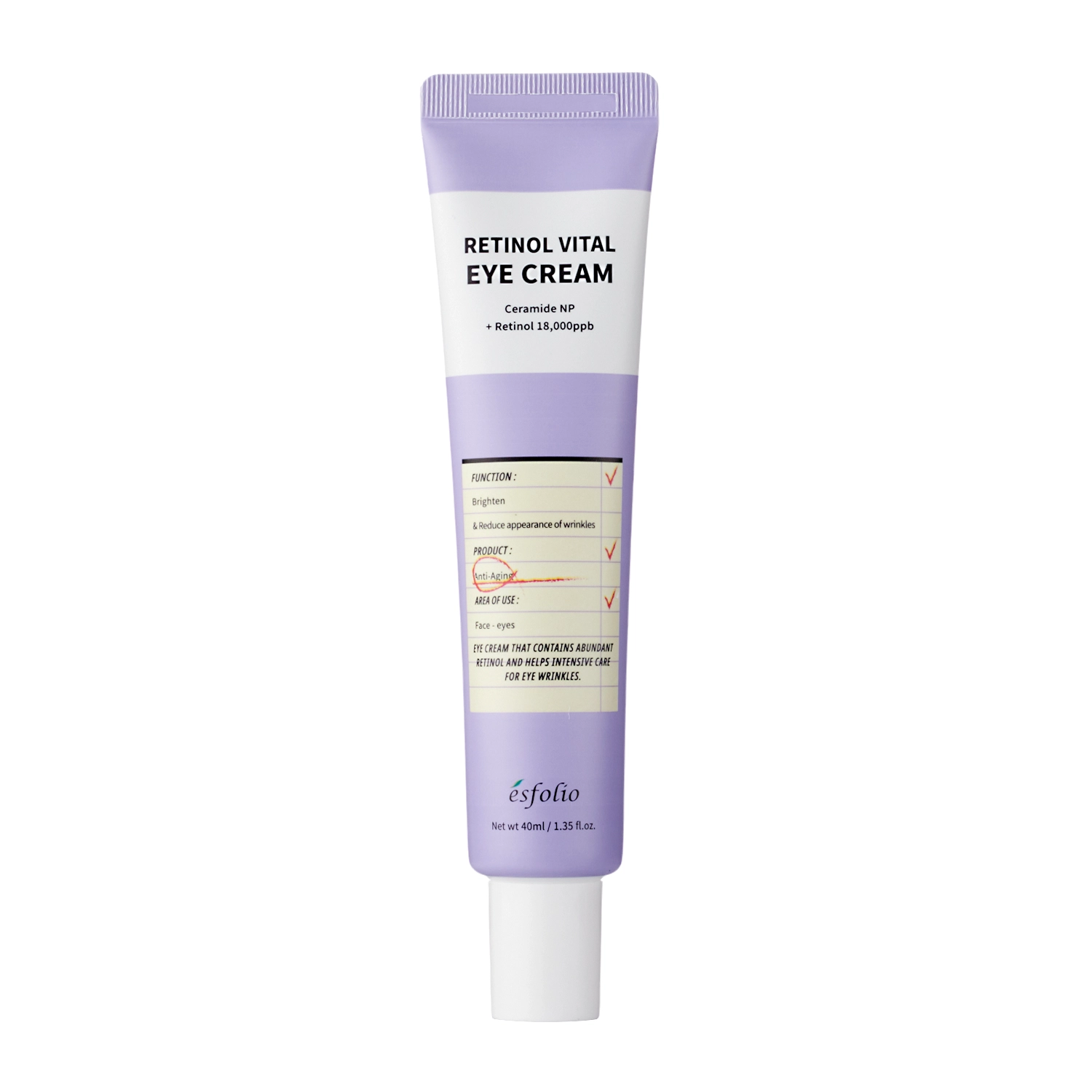 Esfolio - Retinol Vital Eye Cream – paakių kremas, kovojantis su senėjimo požymiais, tinkamas brandžiai, elastingumą praradusiai odai. Sudėtyje yra retinolis, kuris pasižymi nuo senėjimo, stangrinančiu poveikiu ir mažina raukšlių matomumą. Niacinamidas šviesina ir turi antioksidacinį poveikį. Drėkinimu rūpinasi aminorūgštys ir keramidai, kurie papildomai regeneruoja ir stiprina odą. Paprastojo kaštono ekstraktas mažina paburkimą akių srityje ir stiprina kraujagysles.