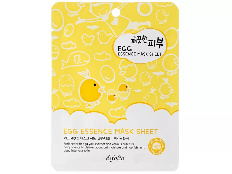 Esfolio - Pure Skin Egg Essence Mask Sheet - lakštinė kaukė su kiaušinio trynio ekstraktu, kuris drėkina, minkština ir maitina odą. Paprastųjų portulakų ekstraktas turi antioksidacinį ir švelninantį poveikį, o ženšenio ekstraktas skatina regeneracijos procesus. Sudėtyje taip pat yra hialurono rūgšties natrio druskos pavidalu Sodium Hyaluronate, kuri suriša vandenį ir palaiko tinkamą odos drėkinimo lygį.