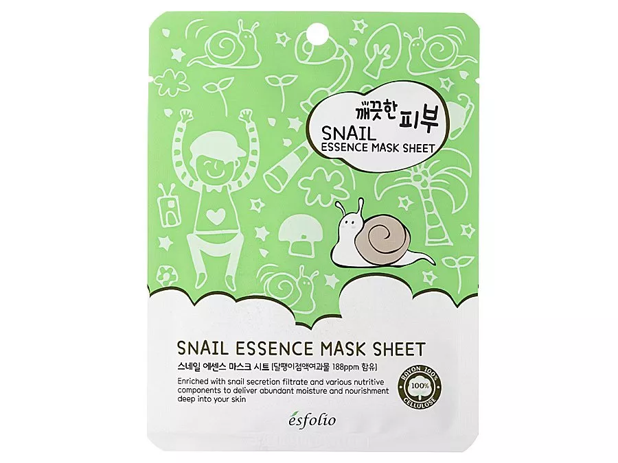 Esfolio - Pure Skin Snail Essence Mask Sheet – kaukė sudėtyje turi sraigių gleivių filtratą, kuris drėkina ir regeneruoja odą, ramina uždegimus ir lėtina odos senėjimo procesus. Papildomai paprastųjų portulakų ekstraktas pasižymi priešuždegiminiu ir šviesinamuoju poveikiu, švelnina sudirgimus ir paraudimus, veikia antioksidaciškai, o ženšenio ekstraktas pasižymi antioksidaciniu, regeneruojančiu ir stangrinančiu poveikiu. Hialurono rūgštis stipriai drėkina, surišdama vandenį odoje.