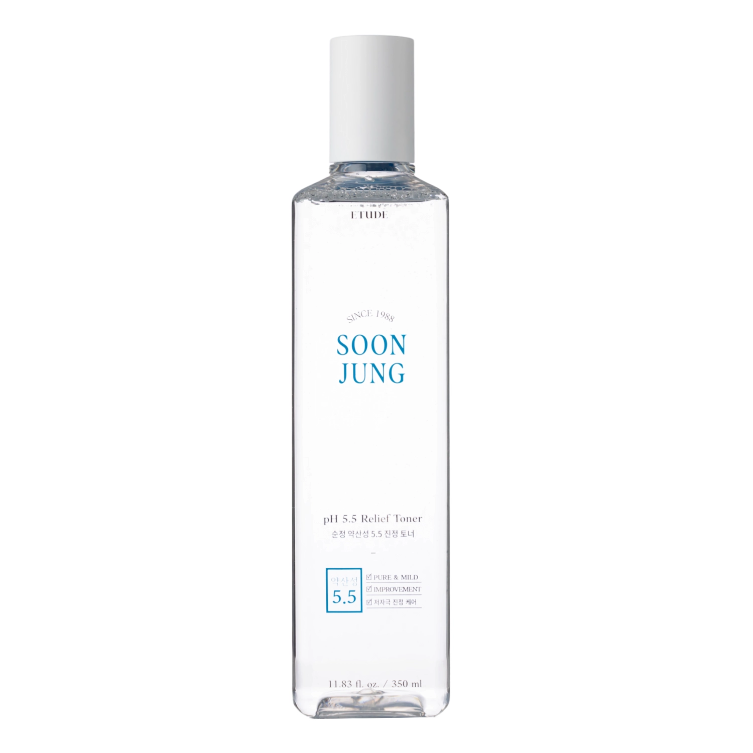 Etude House - SoonJung PH 5.5 Relief Toner - tonikas sausai ir jautriai odai, turintis raminamąjį poveikį. Sudėtyje yra betaino, kuris stipriai drėkina ir ramina, bei madekasosido, kuris regeneruoja odą ir pasižymi priešuždegiminiu poveikiu.