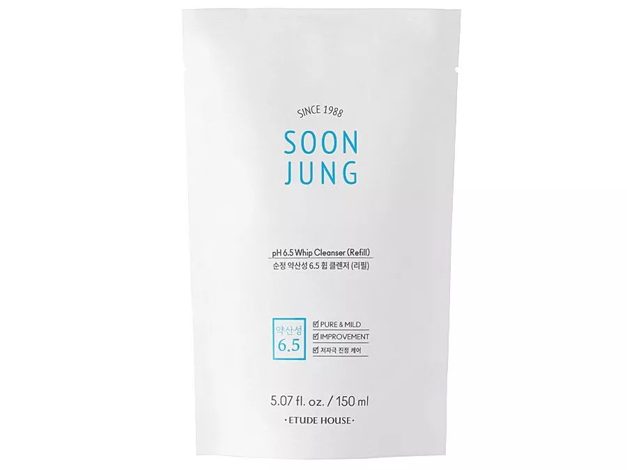 Etude House - Soon Jung pH 6,5 Whip Cleanser (Refill) - veido prausimosi putos, pagrįstos švelniomis valančiomis medžiagomis, kurios efektyviai, bet neagresyviai pašalina nešvarumus ir makiažo likučius nuo odos. Produkto sudėtyje yra ir žaliosios arbatos ekstrakto – antioksidanto, pasižyminčio gaivinančiu ir antibakteriniu poveikiu. Taip pat pridėtas pantenolis švelnina sudirgimus ir paraudimus, o madekasosidas, gaunamas iš azijinės centelės, padeda odos regeneracijos procesams. Produkto pH yra apie 6,5.