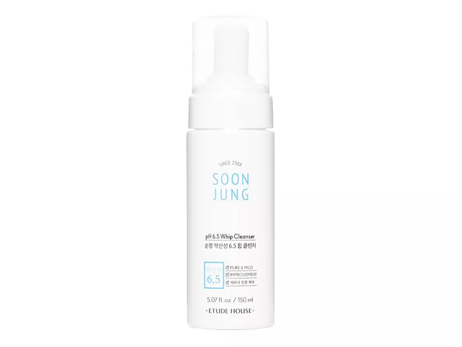Etude House - Soon Jung pH 6,5 Whip Cleanser - veido prausimosi putos, pagrįstos švelniomis valomosiomis medžiagomis, kurios efektyviai, bet neagresyviai valo odą nuo nešvarumų ir makiažo likučių. Produkto sudėtyje taip pat yra žaliosios arbatos ekstrakto – antioksidanto, pasižyminčio gaivinančiu ir antibakteriniu poveikiu. Be to, pantenolis švelnina sudirgimus ir paraudimus, o madekasosidas, gaunamas iš azijinės centelės, skatina odos regeneracijos procesus. Produktas pasižymi maždaug 6,5 pH.