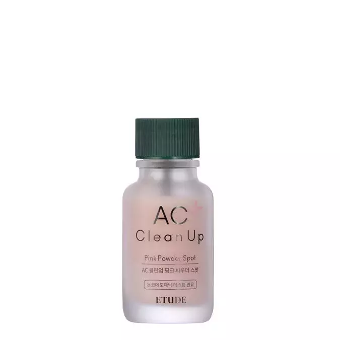 Etude House - AC Clean up Pink Powder Spot - dviejų fazių serumas, skirtas naudoti lokaliai ant spuogų. Sudėtyje yra salicilo rūgšties, kuri reguliuoja perteklinį sebumo išsiskyrimą, pasižymi antibakteriniu poveikiu ir padeda užkirsti kelią spuogų atsiradimui. Arbatmedžio aliejaus ir širdžialapės stimburės ekstrakto derinys veikia bakteriocidiškai, priešuždegimiškai ir sutraukiančiai. Dviejų kalio glicirizino rūgšties druska švelnina sudirgimus, pasižymi seboreguliaciniu poveikiu, antibakteriniu ir priešspuoginiu poveikiu, taip pat pagreitina spuogų gijimą. Madekasosidas stiprina priešuždegiminį poveikį ir padeda odos regeneracijai. Rožinis sluoksnis, pagrįstas kalaminu, mažina sudirgimus ir odos paraudimus.