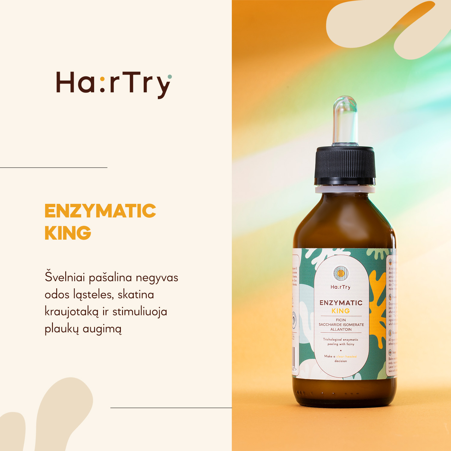 HairTry - Enzymatic King - trichologinis galvos odos šveitiklis, turintis vidutinio stiprumo šveičiamąjį poveikį. Lengva, emulsinė tekstūra ir subtilus, gaivus jūros vėjo kvapas. Ypač tinka odai, kuriai reikia valymo ir drėkinimo, kuri susiduria su sausumu ir niežėjimu. Sudėtyje yra figos fermentas – ficinas, kuris yra 20 kartų stipresnis už papainą, veiksmingai pašalina negyvas epidermio ląsteles, valo plaukų folikulus ir skatina mikrocirkuliaciją. Papildomai sacharidų izomeratas, alantoinas ir skvalanas užtikrina gilų raminimą ir galvos odos maitinimą, mažina niežėjimą. Stiklinis buteliukas su pipete palengvina produkto naudojimą. Pirkdami šį produktą remiate Seedballs Kenya ir ReSea Project fondus.