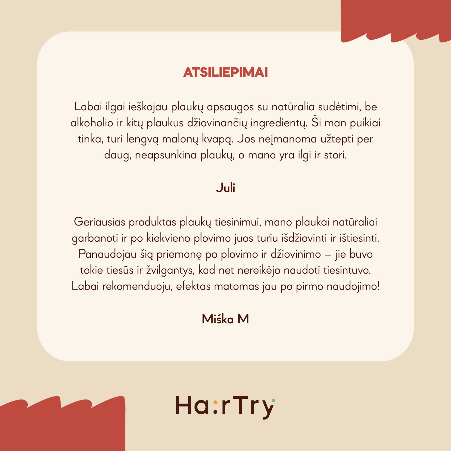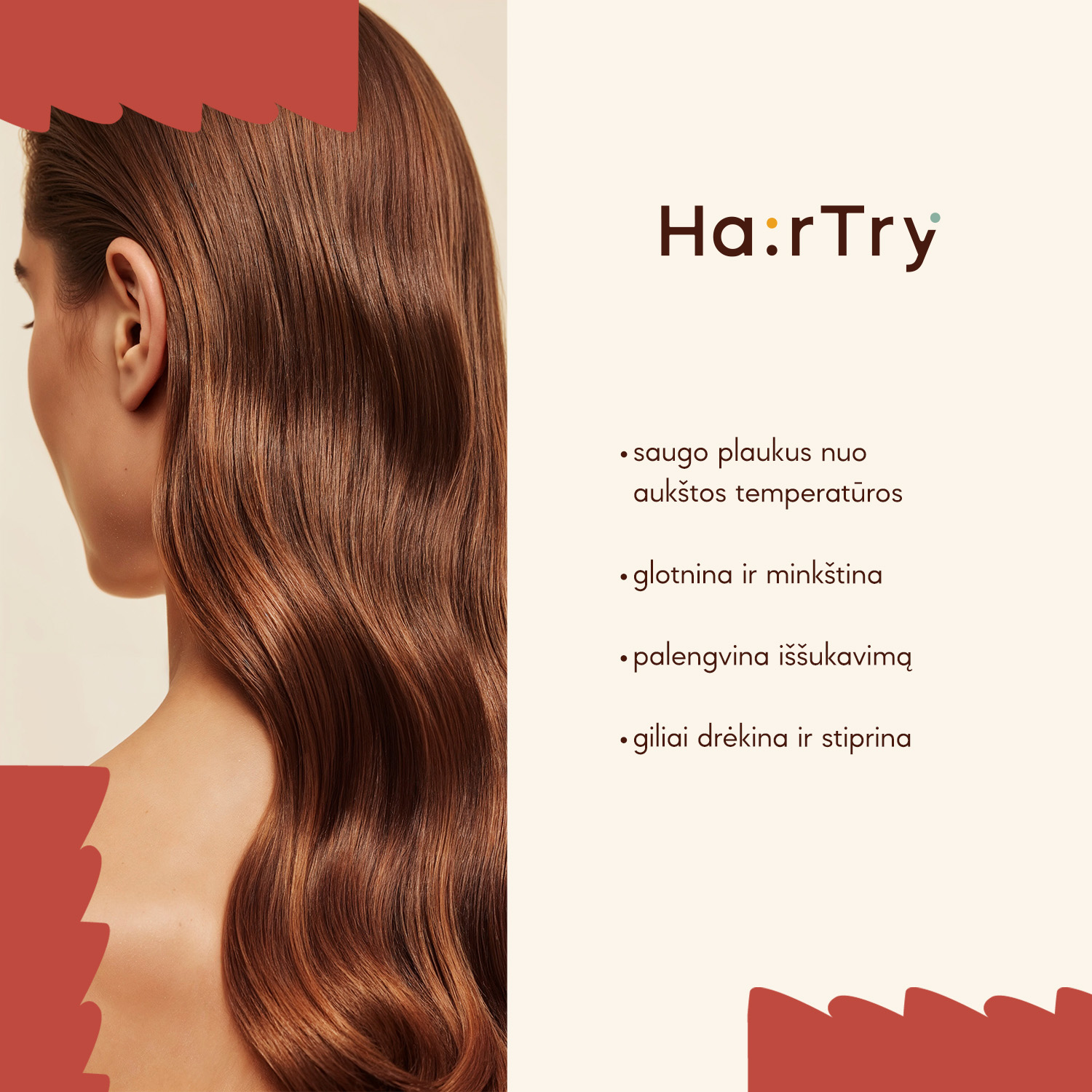 HairTry - Heat Lock – dvifazis kondicionierius, kuris glotnina plaukus ir apsaugo juos nuo karščio iki 230 laipsnių Celsijaus. „Heat Lock“ kondicionierius pasižymi trimis nuo karščio apsaugančios kosmetikos priemonės privalumais – reguliarus jo naudojimas užtikrina apsaugą nuo karščio daromos žalos, garantuoja geresnius šukuosenos formavimo rezultatus, nes plaukai tampa ypač minkšti ir švelnūs, kaip šilkas, o taip pat padeda palaikyti plaukų drėgmės lygį. Sudėtyje yra KERATRIX™ – pailginto atpalaidavimo junginys, kuriame yra peptidų ir aminorūgščių, atsakingų už išorinio plaukų sluoksnio didesnį tvirtumą ir sustiprinimą. Silikonaiir Polyquaternium-7 suformuoja ant plauko paviršiaus okliuzinį sluoksnį, kuris apsaugo nuo vandens išsiskyrimo iš plauko vidaus, taip pat apsaugo nuo mechaninių pažeidimų, žalingo formavimo ar dažymo poveikio. Hidrolizuoti kviečių baltymai prasiskverbia į plauko sluoksnius, stiprina jį iš vidaus, geba pritraukti ir išlaikyti drėgmę, taip pat padeda sumažinti trintį ir lūžinėjimą. Pantenolis suteikia plaukams švelnumo ir glotnumo po naudojimo. Kondicionierius pasižymi maloniu gėlių kvapu, o jo formulė yra veganiška. Apsaugos lygis buvo patikrintas nepriklausomoje laboratorijoje, o rezultatai parodė, kad produktas nesukelia būdingo šilumos sukelto plauko kutikulės atsivėrimo, kuris pastebimas be apsaugos nuo karščio. Įsigydami šį produktą remiate fondus „Seedballs Kenya“ ir „ReSea Project“.