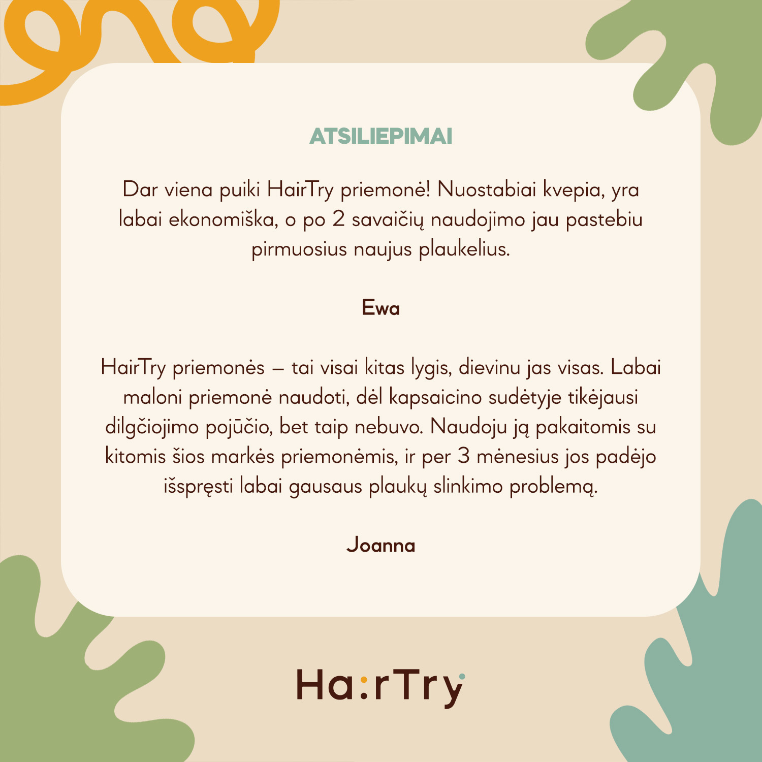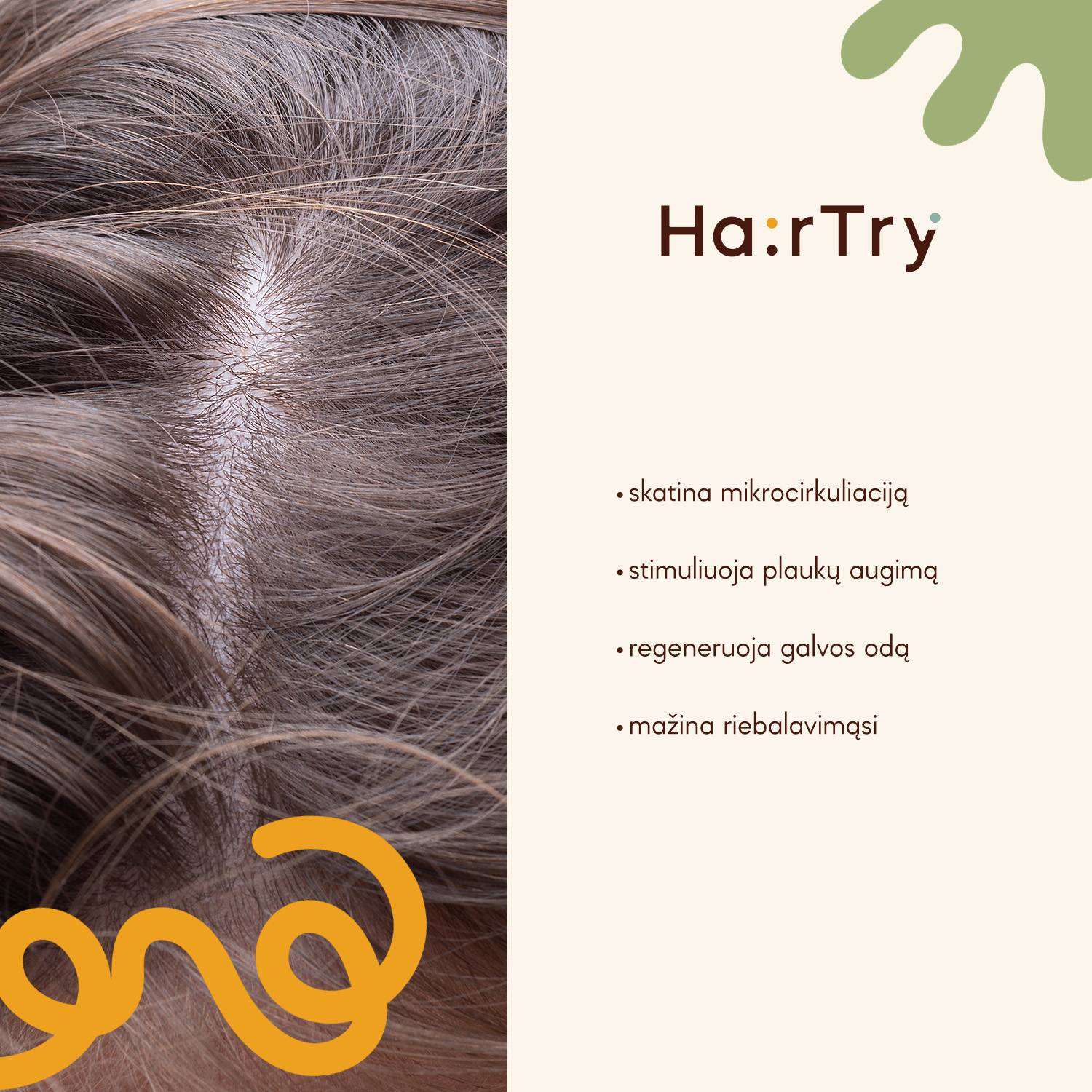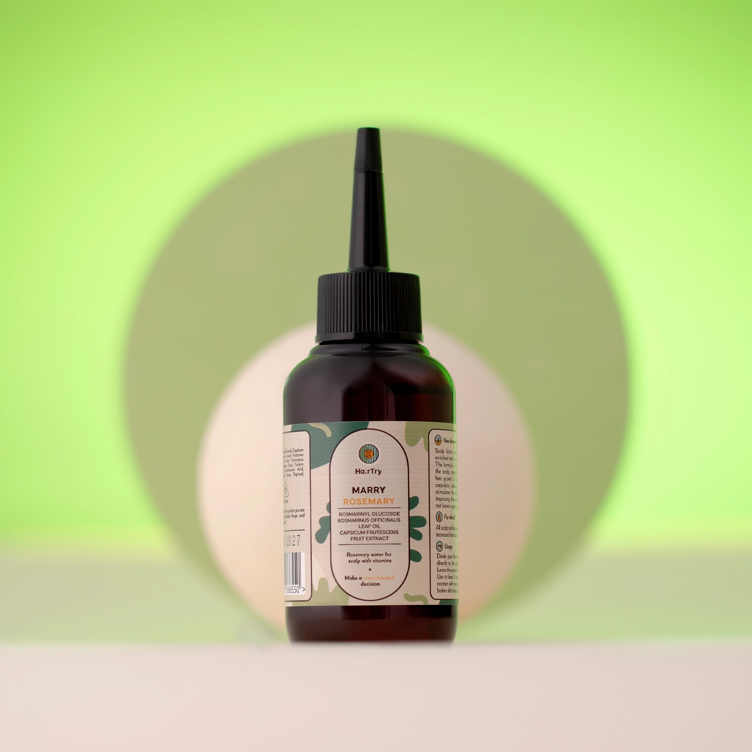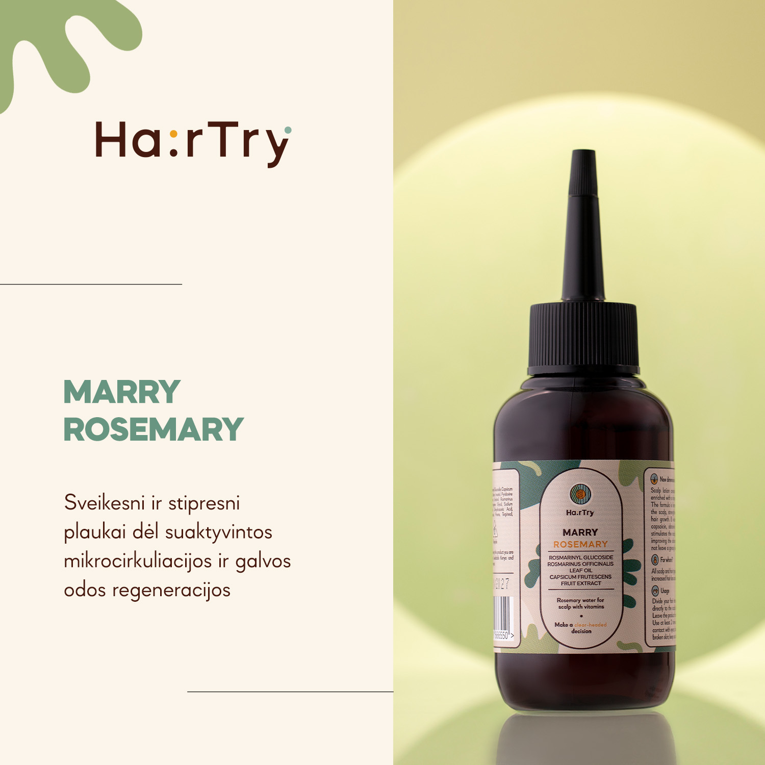 HairTry - Marry Rosemary – galvos odos įtrynimas, visapusiškai naudingas galvos odai ir plaukams. Dėl rozmarinų aliejaus ir kapsaicino produktas natūraliai stimuliuoja mikrocirkuliaciją plaukų folikuluose ir plaukų svogūnėliuose, veikia jų maitinimą, deguonies prisotinimą ir geresnį naujų plaukų bei esamų sruogų augimą. Be to, B grupės vitaminų kompleksas, įskaitant niacinamidą ir biotiną, užtikrina daugialypę galvos odos ir plaukų priežiūrą. Jis rūpinasi sebumo sekrecijos reguliavimu, taip apribodamas plaukų riebalavimosi problemą, stiprina epidermio barjerą, ramina ir švelnina sudirgimus bei mažina nemalonų galvos odos niežėjimą. Sudėtis papildyta rozmarino gliukozidu, kuris neutralizuoja galvos odos senėjimą, skatina regeneraciją ir užkerta kelią plaukų slinkimui. Taigi visų sudedamųjų dalių derinys sukuria lengvą, neapsunkinantį įtrynimą, žolelių ir rozmarinų kvapo, pasižyminti šildomuoju, plaukų augimą skatinančiu, riebalų kiekį reguliuojančiu, priešuždegiminiu ar drėkinamuoju poveikiu. Priemonę rekomenduojame naudoti nusilpusiems plaukams, lėtai augantiems, sudirgimams ir niežuliui, riebiems ar ploniems plaukams. Patogi pakuotė su dozatoriumi puikiai tinka įtrynimo tepimui ir tinka veganams bei vegetarams. Siekdamas kompensuoti panaudotą plastiką, „HairTry“ prekių ženklas remia aplinkosaugos iniciatyvas, tokias kaip „Seedballs Kenya“ ir „ReSea Project“, todėl šis produktas yra etiškesnis pasirinkimas.