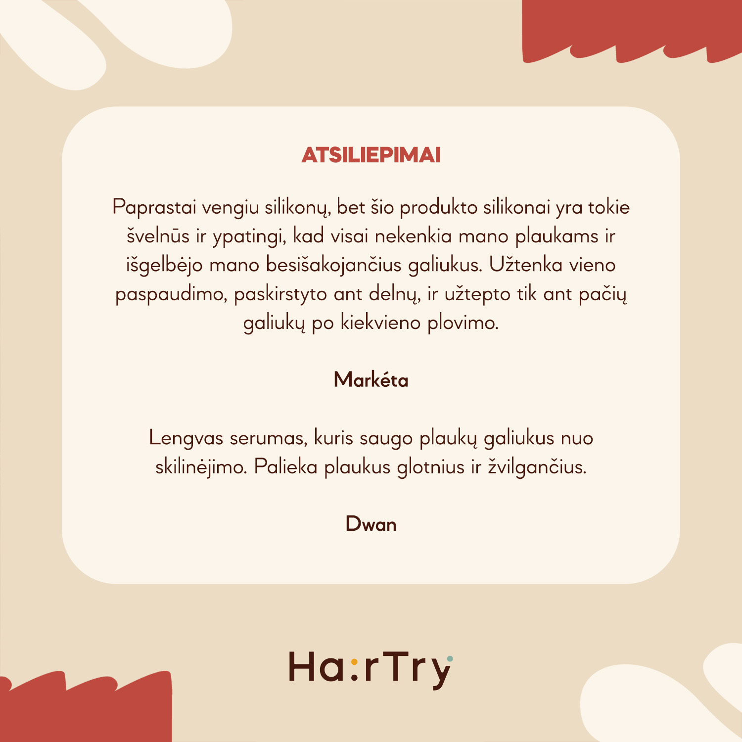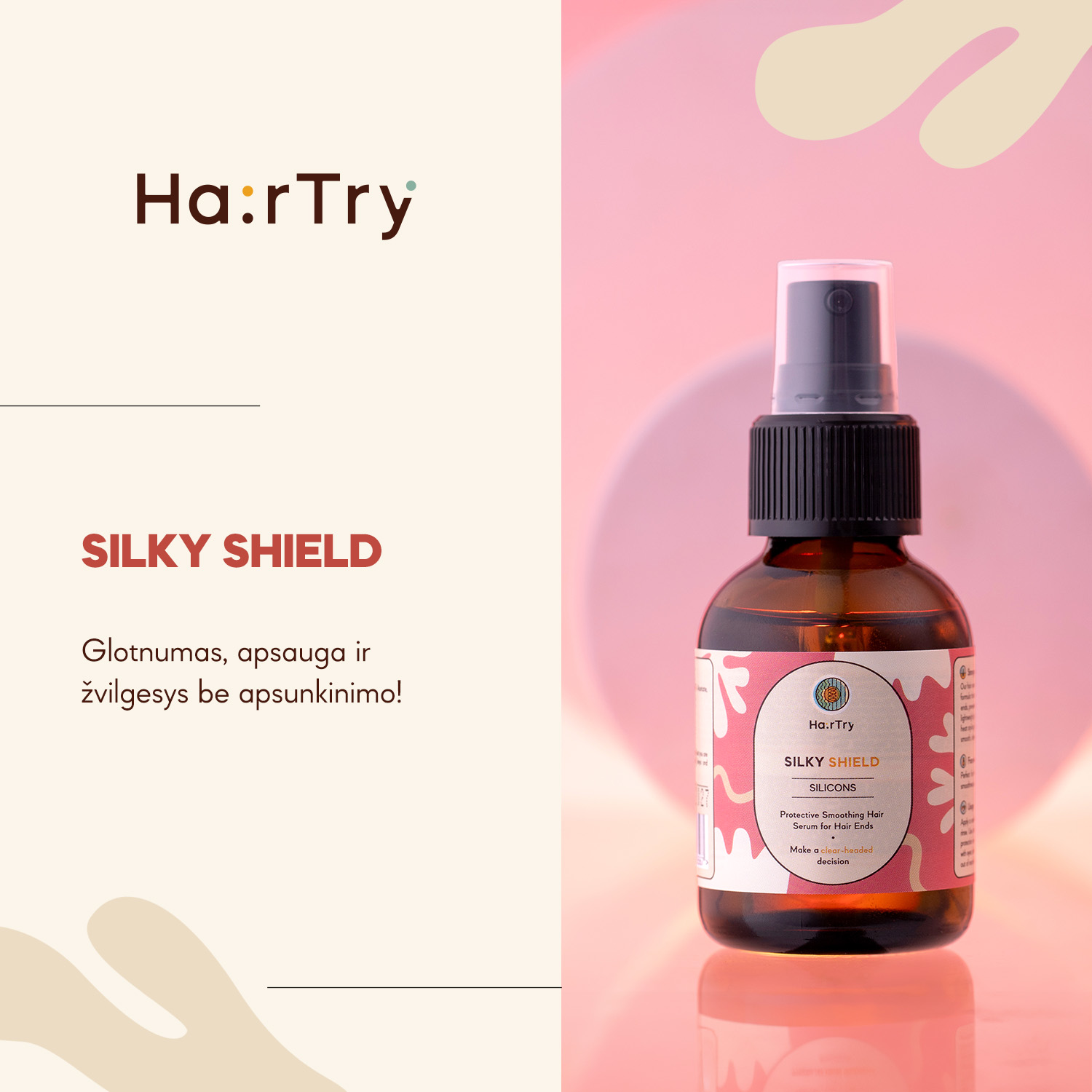 HairTry - Silky Shield – lyginamasis ir apsauginis serumas plaukų galiukams. Priemonė apsaugo sruogas nuo išsausėjimo ar mechaninių pažeidimų, pvz., trinties, sukurdama apsauginį sluoksnį. Be to, akimirksniu sumažina plaukų šiaušimąsi ir suteikia glotnių bei blizgančių plaukų efektą. Serumo formulė yra minimalistinė, be nereikalingų apsunkinančių sudedamųjų dalių, o panaudoti lengvi silikonai, tokie kaip Undecane ir Tridecane, neapsunkina plaukų ir kartu apsaugo juos nuo šiaušimosi. Nedidelis produkto kiekis leidžia pasiekti norimą efektą, todėl serumo pakaks ilgesniam laikui. Lengva, šilkinė skysta konsistencija yra stikliniame indelyje su dozatoriumi, o pridėtos gaivios gėlių kvapo natos papildo priežiūrą ir paverčia ją dar malonesne patirtimi. Priemonę rekomenduojama naudoti ant drėgnų plaukų, kad būtų lengviau juos iššukuoti, arba ant sausų plaukų – norint suteikti jiems glotnumo ir užbaigti jų formavimo procedūrą. Plaukų galiukų serumą „Silky Shield“ gali saugiai naudoti nėščios ir maitinančios krūtimi moterys.