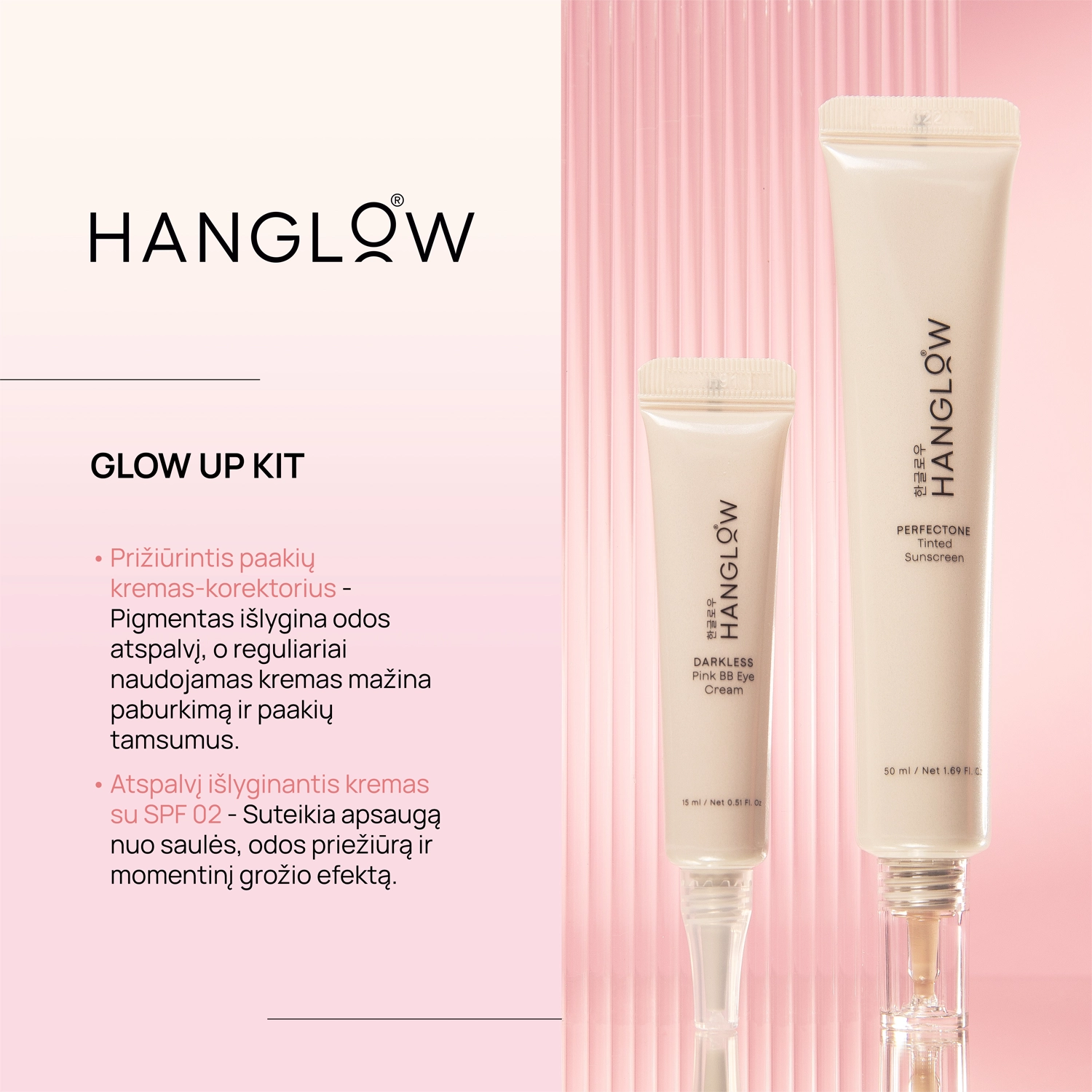 - HanGlow veido ir paakių priežiūros priemonių rinkinys
