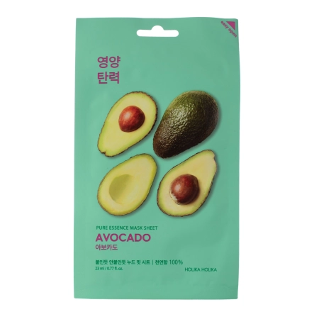 Holika Holika- Pure Essence Mask Sheet - Avocado - drėkinamoji lakštinė kaukė. Jos sudėtyje esantis Centella Asiatica ekstraktas ramina, mažina sudirgimą ir greitina gijimo procesą. Kaukė praturtinta avokadų ekstraktu, kuris skatina odos drėkinimą ir regeneraciją, maitina odą ir saugo ją nuo laisvųjų radikalų žalos. Natrio hialuronatas suriša vandenį epidermyje ir padidina odos drėkinimo lygį, o ramunėlių ekstraktas ramina ir regeneruoja.