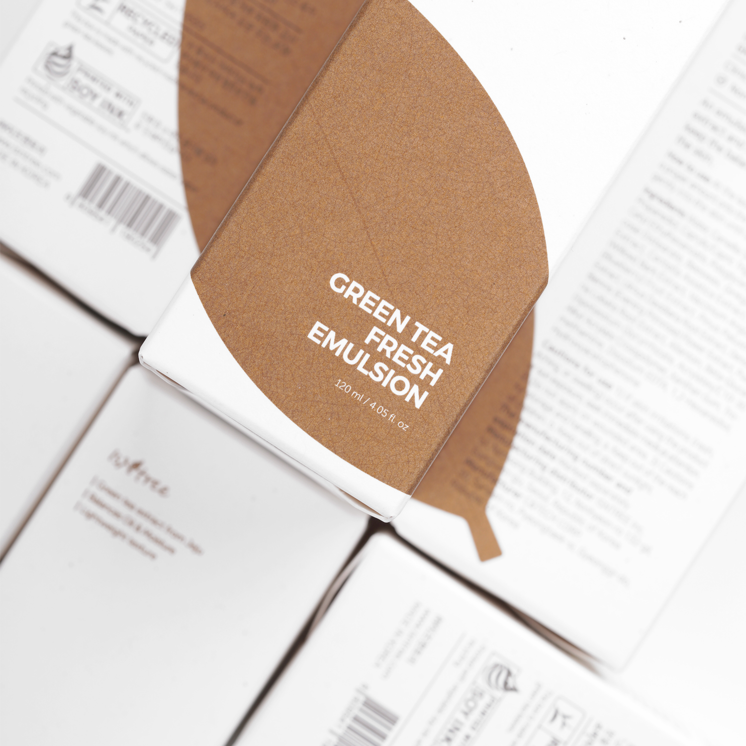 Isntree - Green Tea Fresh Emulsion - emulsija riebiai ir problematiškai odai. Sudėtyje yra daug priešuždegiminių savybių turinčių ingredientų, įskaitant žaliosios arbatos ekstraktą, kuris pasižymi papildomu antioksidaciniu poveikiu. Be to, baltojo gluosnio žievės ekstraktas, turintis daug salicilo rūgšties, pasižymi antiseptiniu, seboreguliaciniu ir valomuoju poveikiu. Jis puikiai mažina uždegimus. Azijinės centelės ekstraktas skatina regeneraciją ir ramina, o japoninio ginkmedžio ekstraktas stiprina kraujagyslių sieneles. Pridėtas beta gliukanas rūpinasi drėkinimo palaikymu ir ramina sudirgimus. Emulsija tinka visų tipų odai, tačiau ypač rekomenduojama riebiai ir į aknę linkusiai odai. Produktas pasižymi lengva tekstūra, kuri greitai įsigeria.