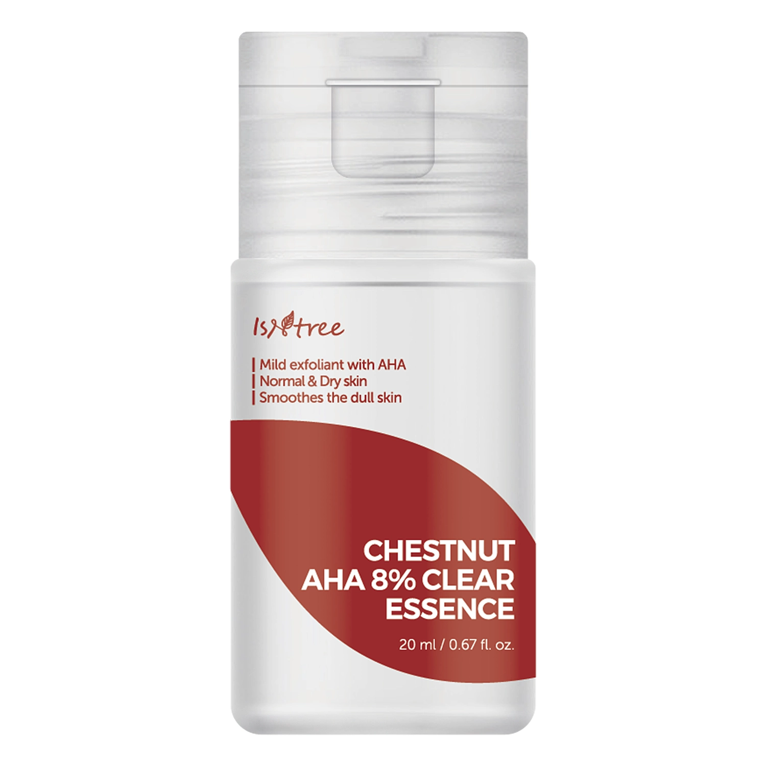 Išlyginamoji esencija su AHA rūgštimis ir azijine centeleIsntree - Chestnut AHA 8% Clear Essence - esencija su AHA rūgštimis - glikolio rūgštimi ir pieno rūgštimi, kurios pašalina negyvas odos ląsteles, drėkina ir reguliuoja riebalų sekreciją, palikdamos odą maloniai švelnią ir lygią. Sudėtyje taip pat yra kaštonų ekstrakto, mažinančio paraudimą, drėkinamojo natrio hialuronato ir azijinės centelės ekstrakto, kuris pirmiausia yra atsakingas už uždegimų malšinimą ir odos regeneraciją. Užtepus esenciją, oda tampa akivaizdžiai lygi, švelni ir nuraminta. Reguliarus produkto naudojimas pagerina probleminės, šiurkščios ar nevienodo atspalvio odos išvaizdą. Produkto pH yra 3,5-4.