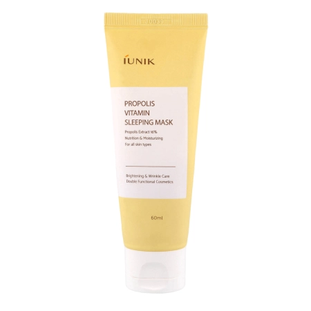 iUNIK - Propolis Vitamin Sleeping Mask - tai naktinė drėkinamoji kaukė su 16 % propolio ekstrakto. Propolį sukuria bitės, tai antibakterinių, antiseptinių, priešuždegiminių ir priešgrybelinių savybių turintis ingredientas, greitinantis žaizdų gijimą. Propolis pasižymi antioksidacinėmis savybėmis dėl jame esančių vitaminų - A, B1, B2, B2, B3, C, bioflavonoidų ir mineralų - kalcio, magnio, geležies, cinko, silicio, kalio, fosforo, mangano ir kobalto, jame yra daugiau kaip 50 skirtingų flavonoidų. Kaukėje taip pat yra šaltalankių ekstrakto, kuriame gausu vitaminų C, A ir E, beta karotino, mineralų, aminorūgščių ir riebalų rūgščių. Ji puikiai tinka į aknę linkusiai odai. Produktas su natūralios kilmės ingredientais.