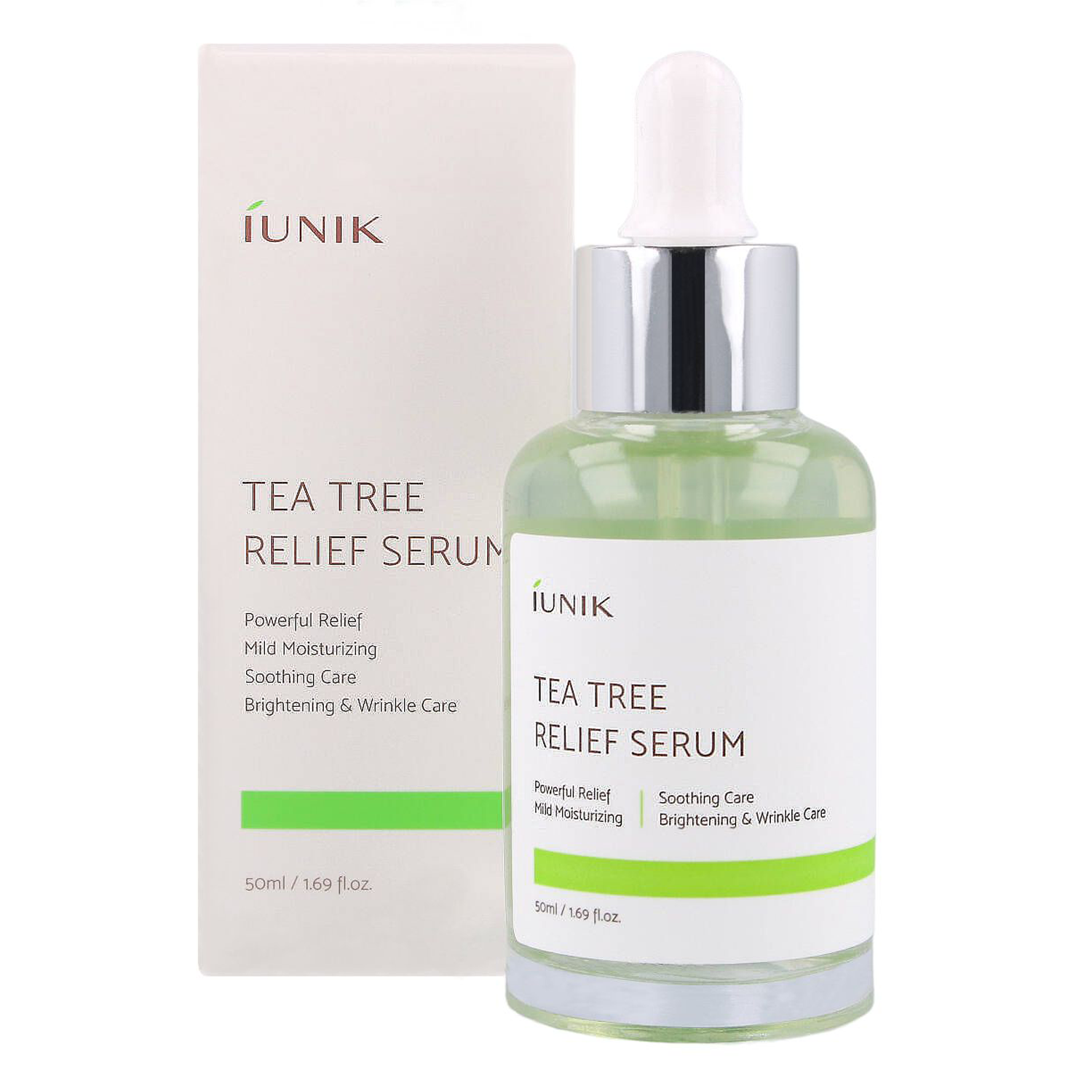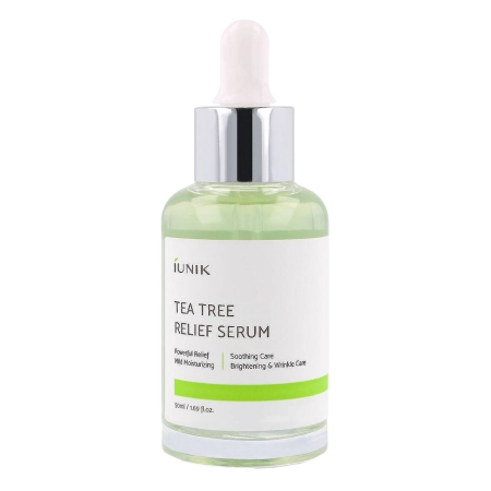 iUNIK- Tea Tree Relief Serum -tai specialus serumas į aknę linkusiai odai su arbatmedžio vandeniu, pasižymintis priešuždegiminėmis ir antibakterinėmis savybėmis. Serumo sudėtyje taip pat yra Centella Asiatica ekstrakto, kuris greitina žaizdų gijimą ir drėkina, bei niacinamido, kuris reguliuoja riebalinių liaukų veiklą ir šviesina hiperpigmentaciją. Produktas yra be kvapiųjų medžiagų, jo sudėtyje yra natūralios kilmės ingredientų.