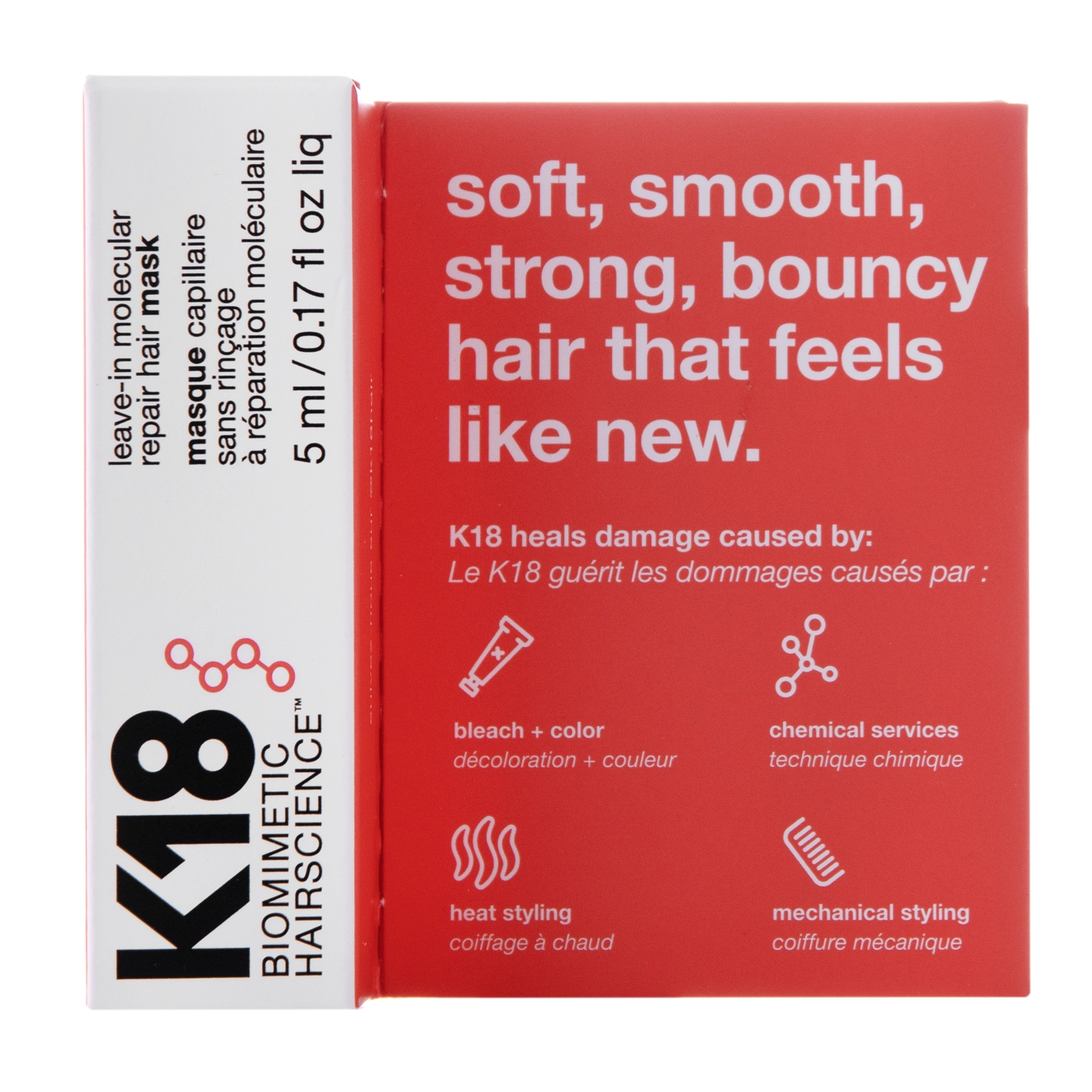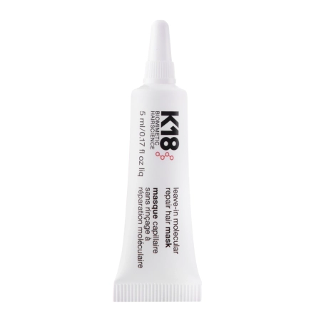 K18 - Leave-in Molecular Repair Hair Mask -atstatomoji plaukų kaukė, skirta visų tipų plaukams. Skatina plaukų struktūros pažeidimų, atsiradusių dėl dažymo, balinimo ir karščio, atstatymą. Sudėtyje yra patentuoto ingrediento K18PEPTIDE™. Tai peptidas, stiprinantis plaukus ir turintis atkuriamąjį poveikį. Jis išlygina žalą atstatydamas pažeistas keratino jungtis ir disulfidinius tiltus, pagerindamas plaukų būklę. Pridėti hirolizuotų kviečių proteinai drėkina, minkština ir mažina plaukų elektrinimąsi. Kaukė suteikia plaukams elastingumo, minkština ir glotnina plaukus.