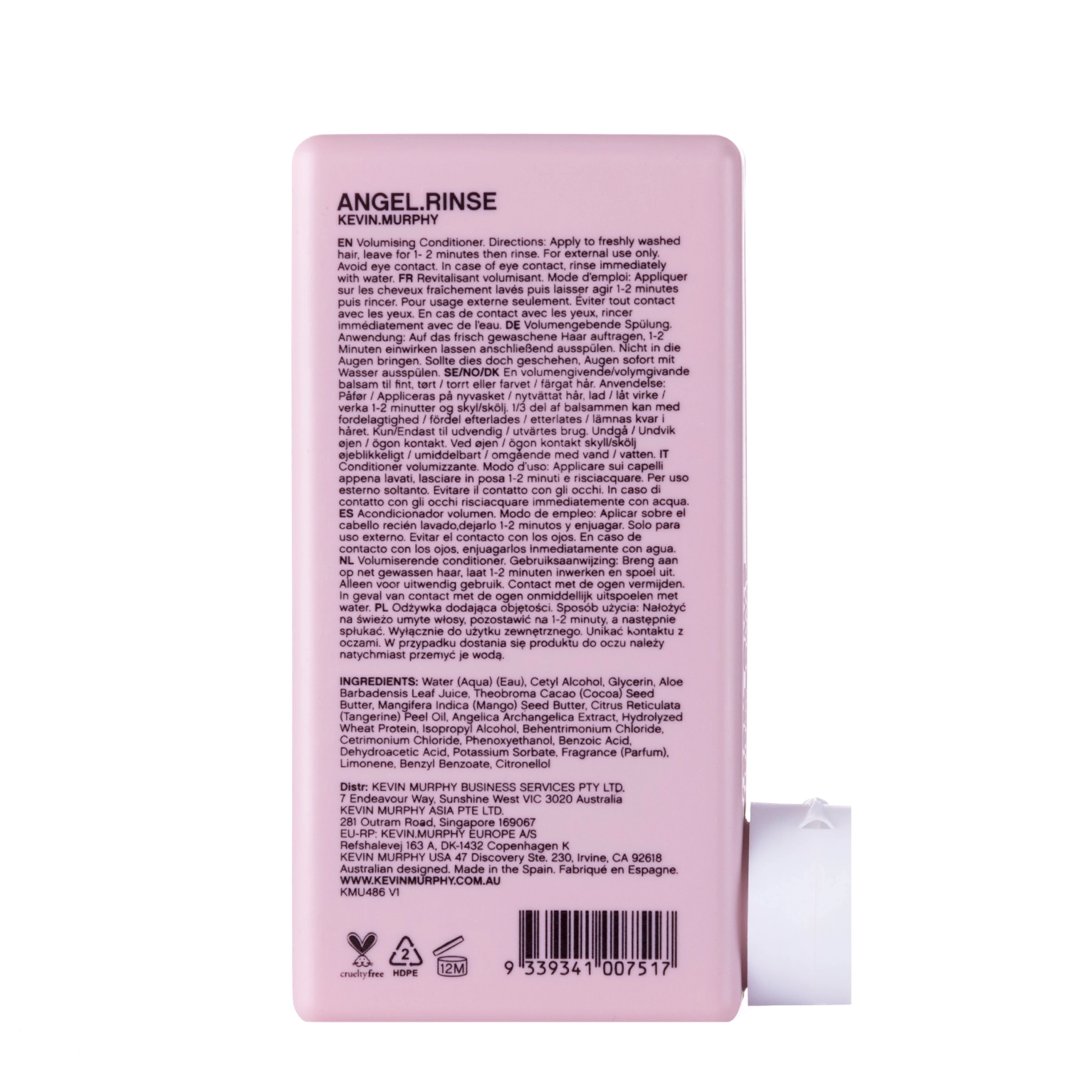 Kevin Murphy - Angel Rinse - kondicionierius, suteikiantis apimties ir stiprinantis dažymo bei kirpimo procedūrų pažeistus plaukus. Sudėtyje yra mango sviestas, kuris suteikia plaukams elastingumo, taip pat kakavos sviestas, kuris saugo nuo drėgmės praradimo ir išorinių veiksnių. Alavijo sultys drėkina plaukus ir švelnina galvos odos sudirgimus. Kviečių baltymų hidrolizatas regeneruoja ir sumažina plaukų elektrinimąsi. Plaukai tampa minkšti, o jų apimtis atstatoma.