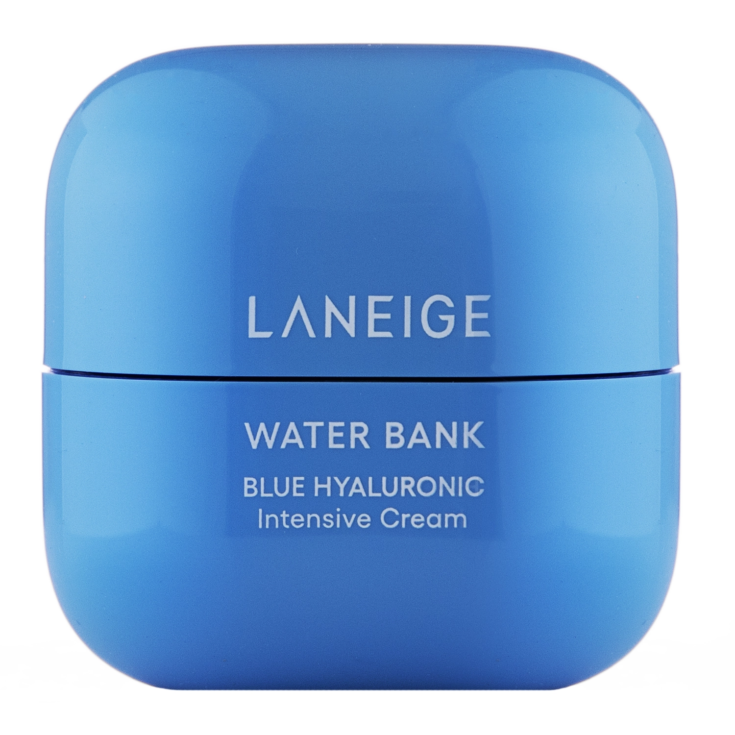 Laneige - Water Bank Blue Hyaluronic Intensive Cream - kasdienės priežiūros kremas, skirtas odai, kuriai reikia intensyvios regeneracijos ir drėkinimo. Kosmetikos priemonės sudėtyje esanti mėlynoji hialurono rūgštis dėl labai mažos molekulės gali prasiskverbti į gilesnius odos sluoksnius ir efektyviau juos drėkinti. Pridėtas natūralus tarpląstelinis cementas, t. y. keramidas NP, palaikys epidermio hidrolipidinį apvalkalą, o O - mega peptidų kompleksas pagerins odos stangrumą ir elastingumą. Undaria pinnata dumblių ekstraktas sušvelnins bet kokį uždegimą ir sudirgimus, o slopindamas tirozinazės procesą užkirs kelią hiperpigmentacijai. Pridėtas niacinamidas sumažins riebalinių liaukų išskiriamo sebumo kiekį ir neutralizuos žalingą laisvųjų radikalų, atsakingų už ankstyvą odos senėjimą, poveikį.