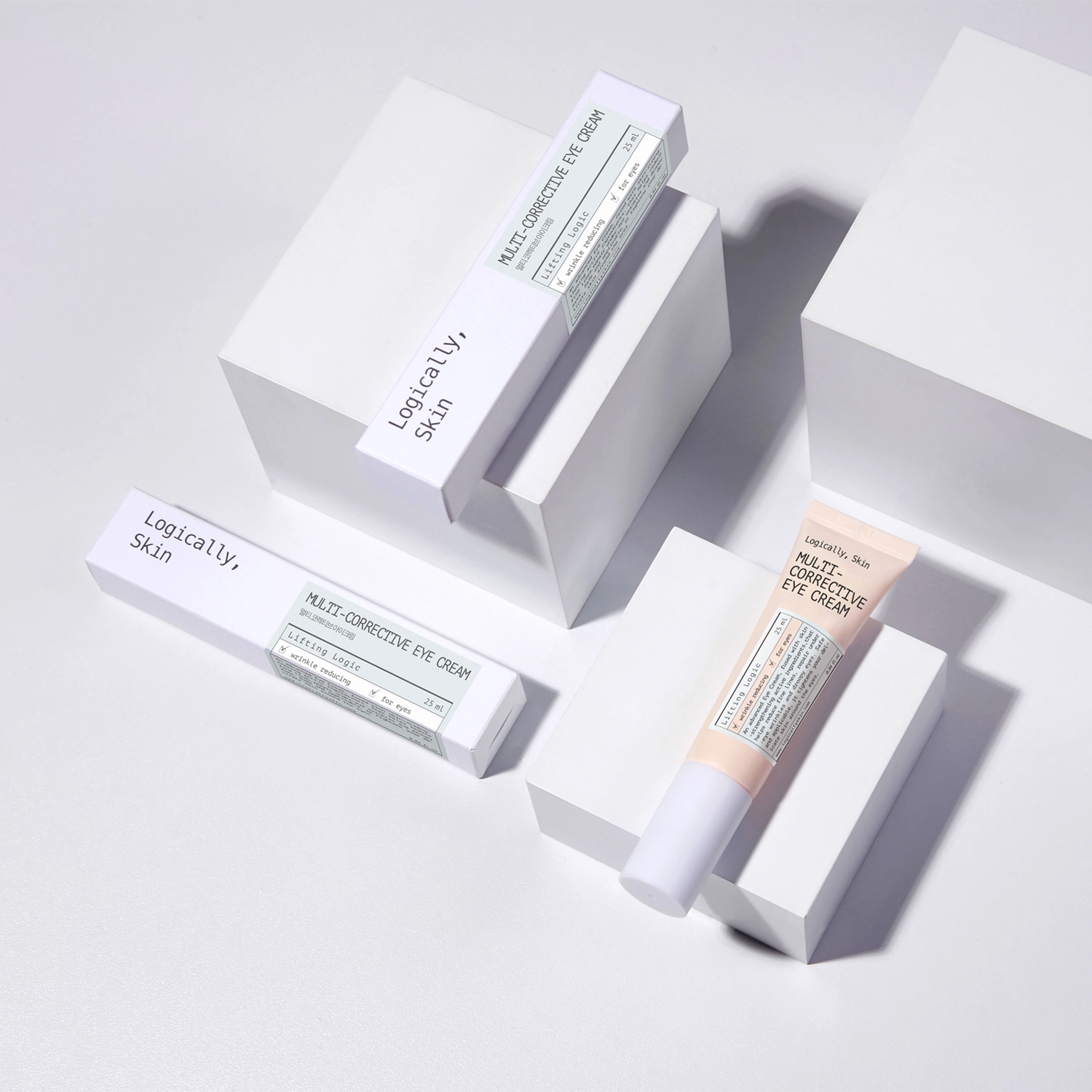 Logically, Skin - Multi-Corrective Eye Cream – stangrinamasis kremas, skirtas kasdienei akių srities priežiūrai. Kosmetikos priemonės sudėtyje esantis sviestmedžio sviestas sudaro ant odos paviršiaus plėvelę, kuri apsaugo ją nuo per didelio vandens kiekio praradimo. O tokoferilo acetatas yra vienas stipriausių antioksidantų, kuris neutralizuoja žalingą laisvųjų radikalų poveikį ir padeda apsaugoti odą nuo neigiamo saulės spindulių poveikio. Sudėtyje esantis adenozinas, apribodamas raumenų skaidulų susitraukimą, mažina raukšles, o hialurono rūgštis gerina odos drėkinimą. Kremo sudėtyje esantis levandų aliejus slopina uždegimus ir spartina odos regeneracijos procesus.