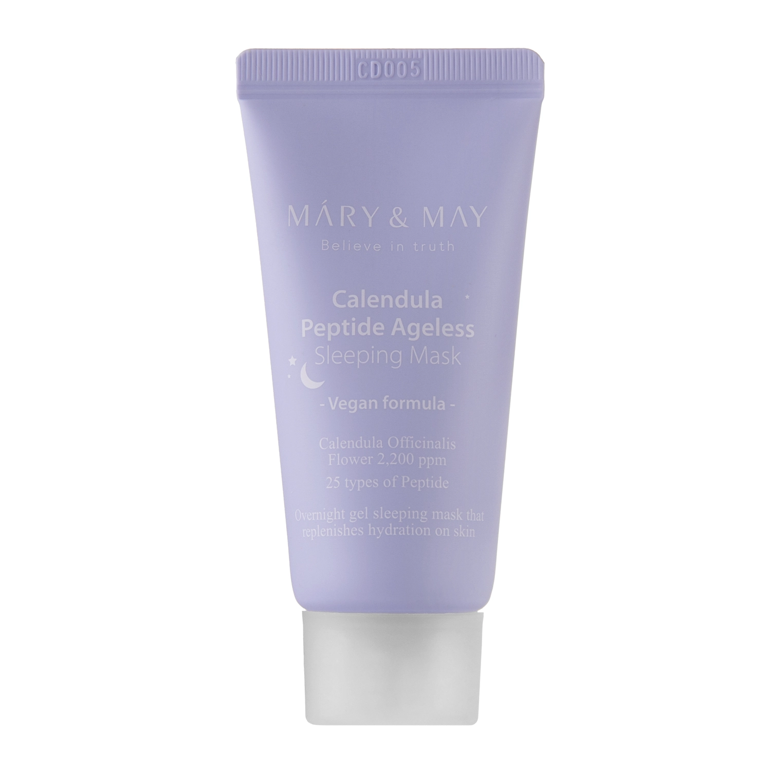 Mary&May - Vegan Calendula Peptide Ageless Sleeping Mask - naktinė veido kaukė, skirta pagerinti odos stangrumą ir drėkinimą bei sumažinti sudirgimą. Priemonės sudėtyje yra medetkų ir azijinių centelių ekstraktų, kurie dėl savo priešuždegiminių savybių ramina sudirgimą, paraudimą ir sausą odą bei spartina epidermio regeneracijos procesą. Net 25 peptidų kompleksas stangrina odą, užkerta kelią priešlaikiniam senėjimui ir raukšlių atsiradimui, o natrio hialuronatas užtikrina tinkamą odos drėkinimą. Jį papildo odos barjerą stiprinantis keramidai, kuris maitina odos ląsteles. Produktas yra veganiškas.
