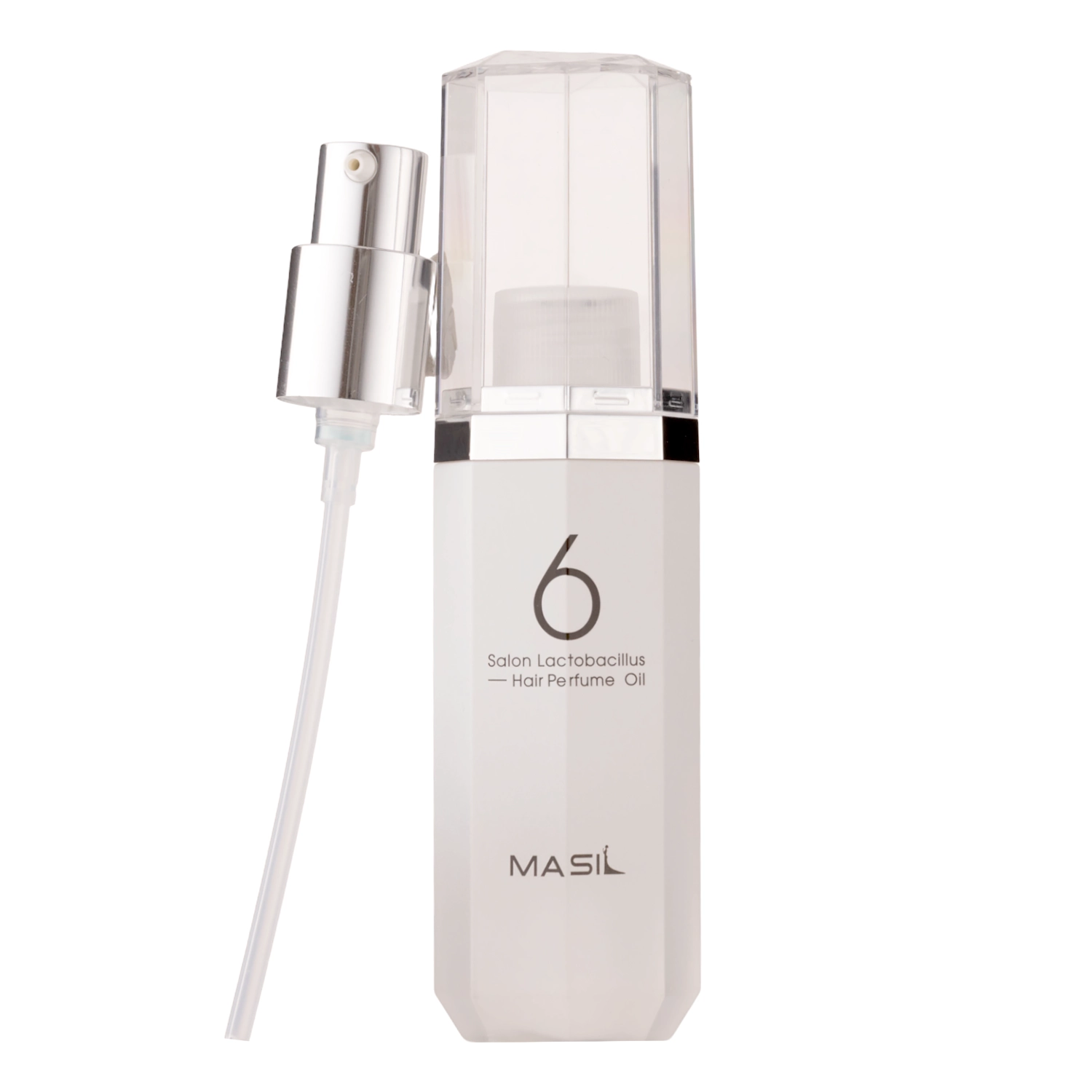 Masil - 6 Salon Lactobacillus Hair Perfume Oil Light - parfumuotas plaukų aliejus, suteikiantis sruogoms malonų aromatą, kuris išlieka ilgą laiką. Dėl sudėtyje esančių minkštinamųjų medžiagų, tokių kaip marulos, argano ir vynuogių sėklų aliejai, jis turi papildomų kondicionuojamųjų savybių. Jie pasižymi maitinamuoju, drėkinamuoju, švelninamuoju ir minkštinamuoju poveikiu. Jie suteikia plaukams gražaus blizgesio ir elastingumo. Drėkinamąjį poveikį palaiko fermentuotas sojų ekstraktas .