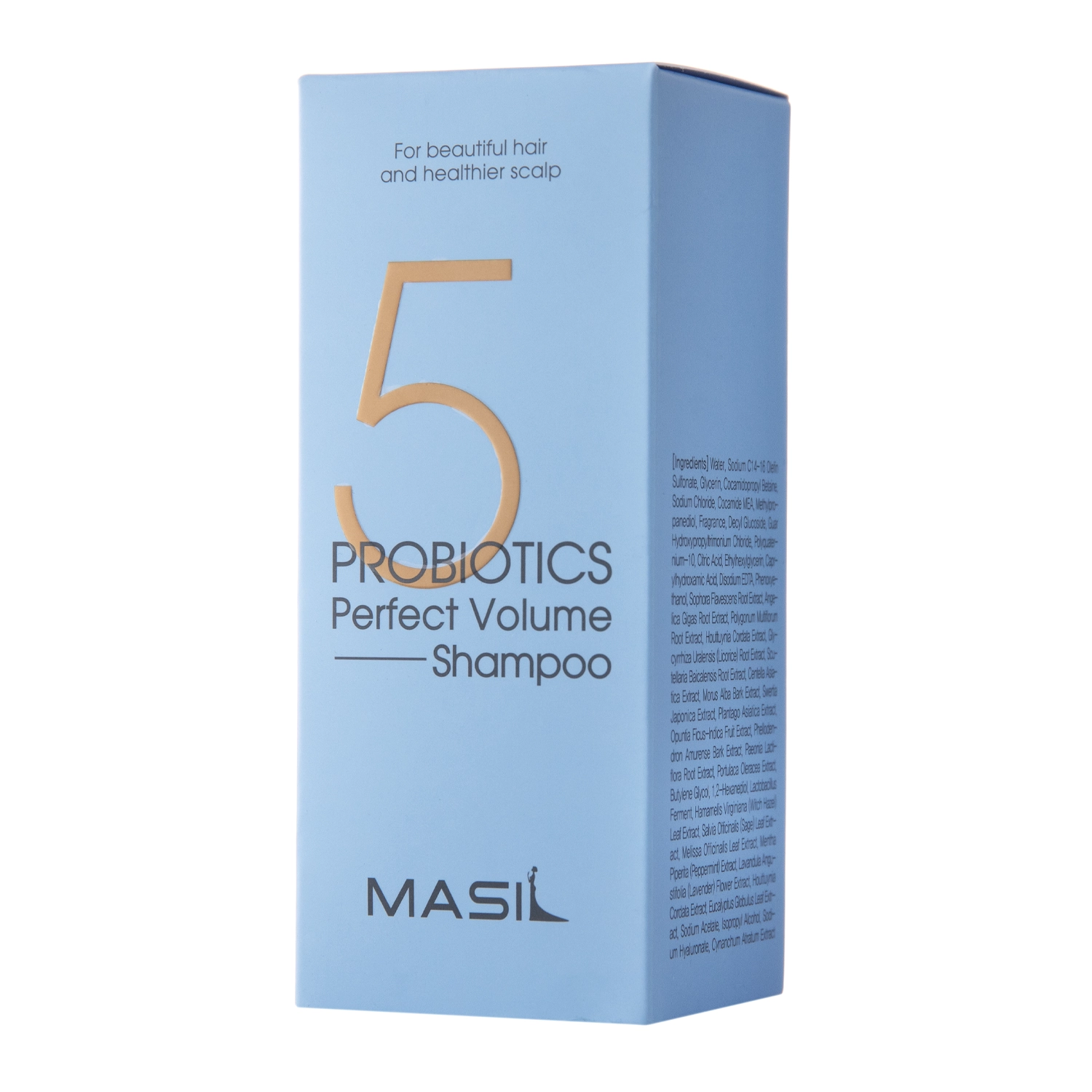 Masil - 5 Probiotics Perfect Volume Shampoo - šampūnas, kuris veiksmingai pašalina nešvarumus nuo galvos odos ir plaukų bei suteikia plaukams apimties. Produkto sudėtis yra papildyta fermentais, palaikančiais galvos odos apsauginį barjerą, azijinės centelės ekstraktu, kurių poveikis stiprina plaukų šaknis, taip pat pipirmėčių ekstraktu, kuris papildomai apsaugo nuo pleiskanų susidarymo. Dėl sudėtyje esančio natrio hialuronato plaukai po šampūno naudojimo tampa sudrėkinti ir maloniai švelnūs prisilietimui. Sudėtyje yra natūralios kilmės ingredientų.
