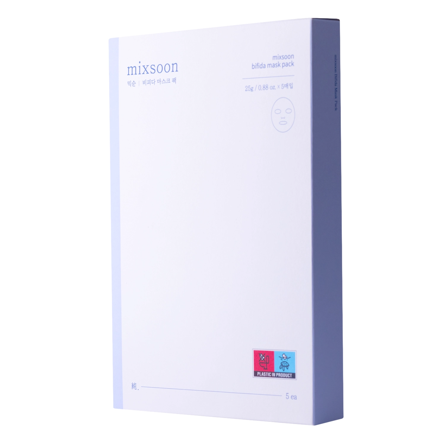 Mixsoon - Bifida Mask Pack - 5 lakštinių kaukių rinkinys, pasižymintis drėkinamuoju ir raminamuoju poveikiu. Jos pagamintos iš malonios medžiagos, kuri gerai priglunda prie odos. Jų sudėtyje yra vertingų fermentų, kurie stiprina apsauginį barjerą ir reguliuoja riebalų išsiskyrimą. Dėl sudėtyje esančio pantenolio ir alantoino produktas puikiai ramina sudirgimą ir paraudimą. Natrio hialuronatas intensyviai drėkina odą. Produkto formulė yra veganiška.